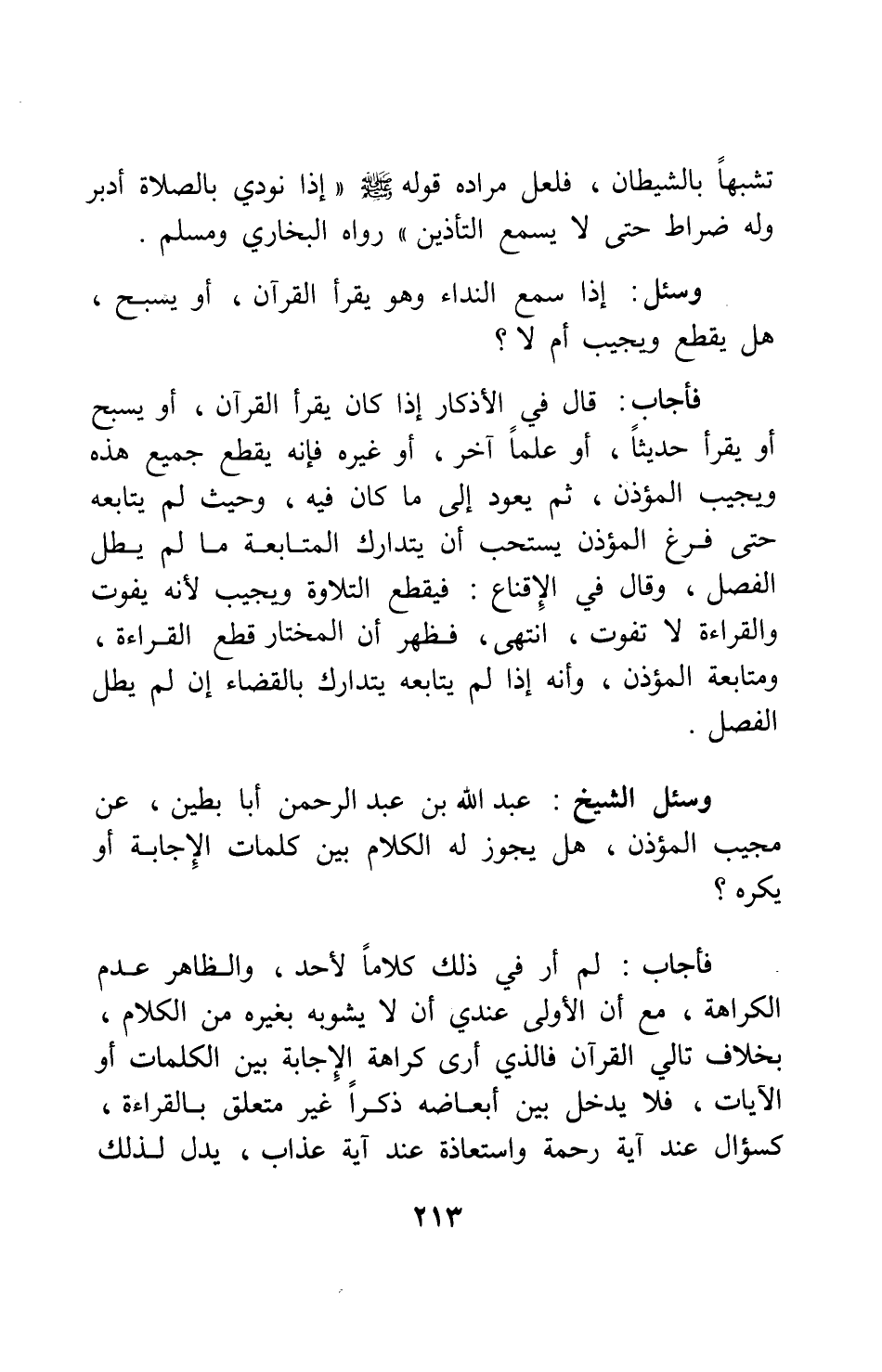 وسئل الشيخ عبد الله بن عبد الرحمن أبا بطين: عن مجيب المؤذن هل يجوز له الكلام بين كلمات الإجابة أو يكره؟