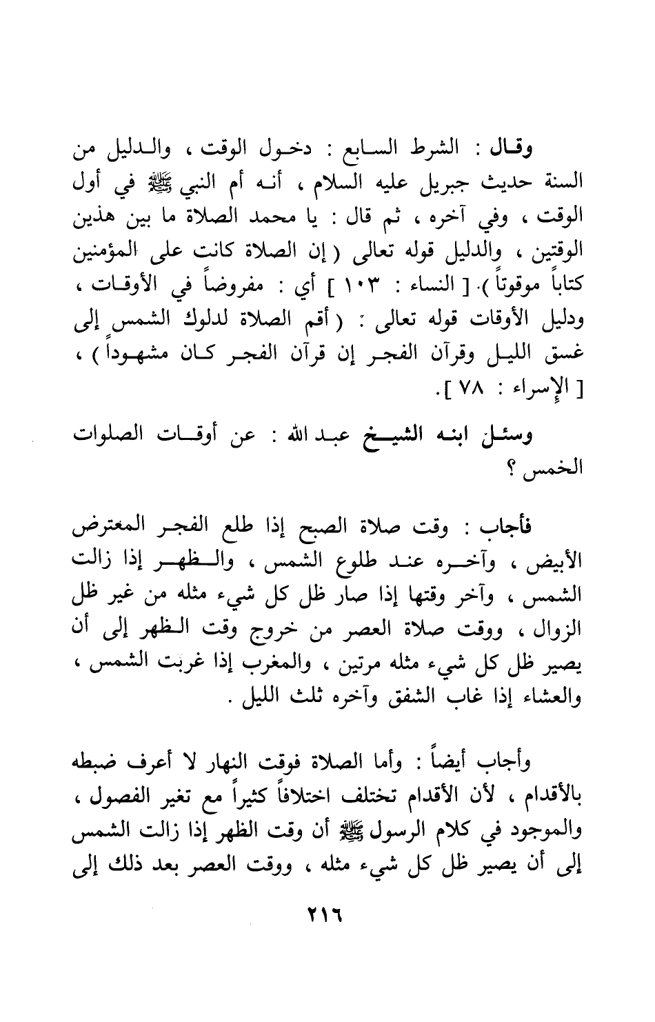 وسئل ابنه: الشيخ عبد الله: عن أوقات الصلوات الخمس؟