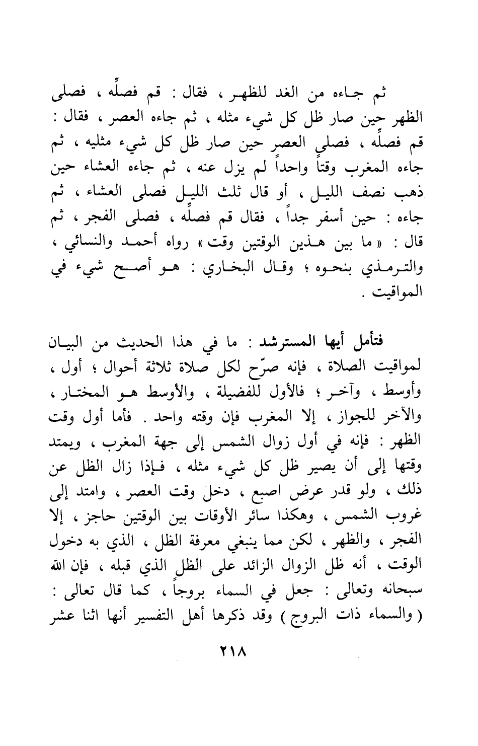 فتأمل أيها المسترشد: ما في هذا الحديث من البيان لمواقيت الصلاة، فإنه صرح لكل صلاة ثلاثة أحوال: أول، وأوسط، وآخر. فالأول للفضيلة، والأوسط هو المختار، والآخر للجواز، إلا المغرب فإن وقته واحد. فأما أول وقت الظهر: فإنه في أول زوال الشمس إلى جهة المغرب، ويمتد وقتها إلى أن يصير ظل كل شيء مثله. فإذا زال الظل عن ذلك ولو قدر عرض إصبع، دخل وقت العصر، وامتد إلى غروب الشمس. وهكذا سائر الأوقات بين الوقتين حاجز، إلا الفجر والظهر؛ لكن مما ينبغي معرفة الظل، الذي به دخول الوقت، أنه ظل الزوال الزائد على الظل الذي قبله، فإن الله سبحانه وتعالى جعل في السماء بروجاً، كما قال تعالى: {وَالسَّمَاءِ ذَاتِ الْبُرُوجِ} [سورة البروج آية: 1] ، وقد ذكرها أهل التفسير أنها اثنا عشر