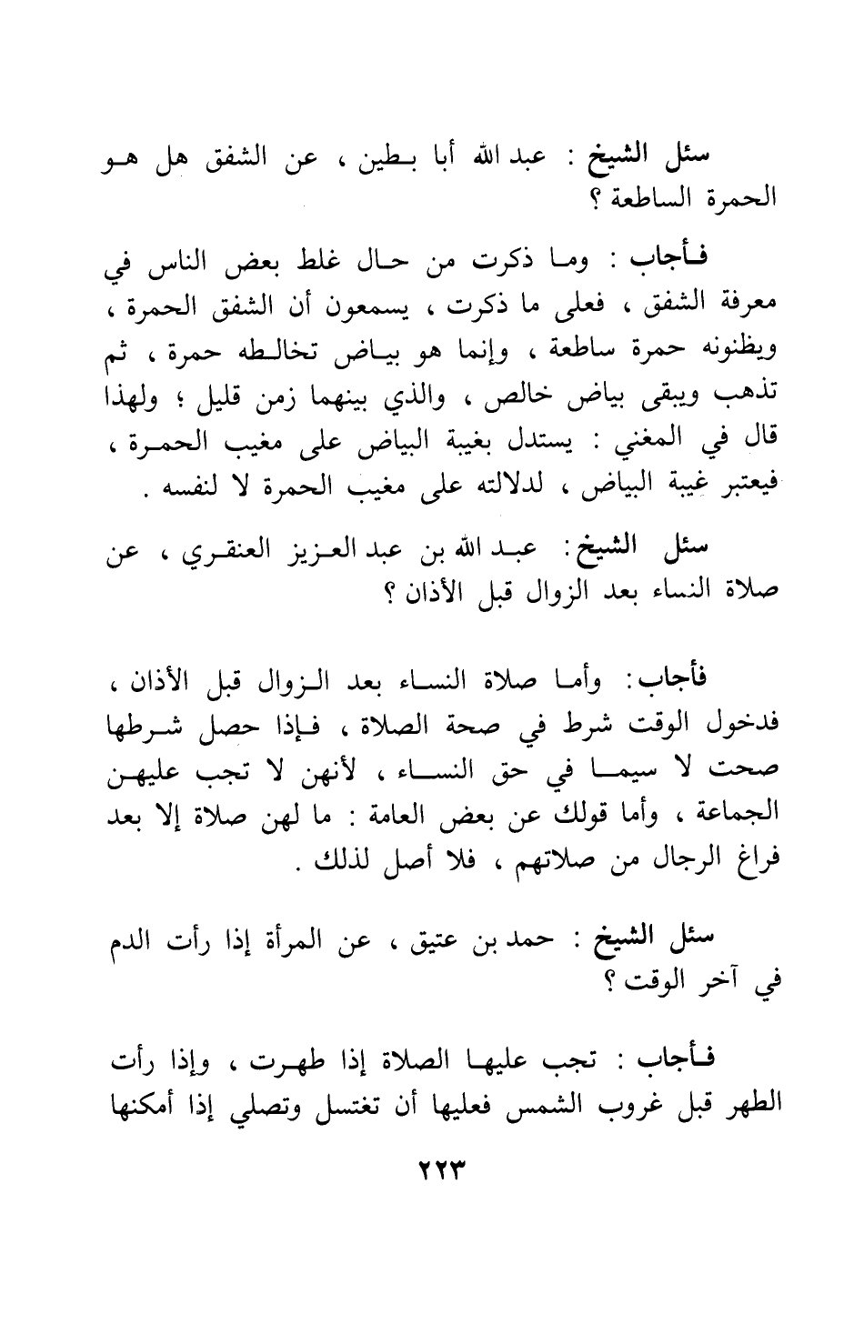 فأجاب: وما ذكرت من حال غلط بعض الناس في معرفة الشفق، فعلى ما ذكرت، يسمعون أن الشفق الحمرة، ويظنونه حمرة ساطعة؛ وإنما هو بياض تخالطه حمرة، ثم تذهب ويبقى بياض خالص، والذي بينهما زمن قليل؛ ولهذا قال في المغني: يستدل بغيبة البياض على مغيب الحمرة، فيعتبر غيبة البياض، لدلالته على مغيب الحمرة لا لنفسه.