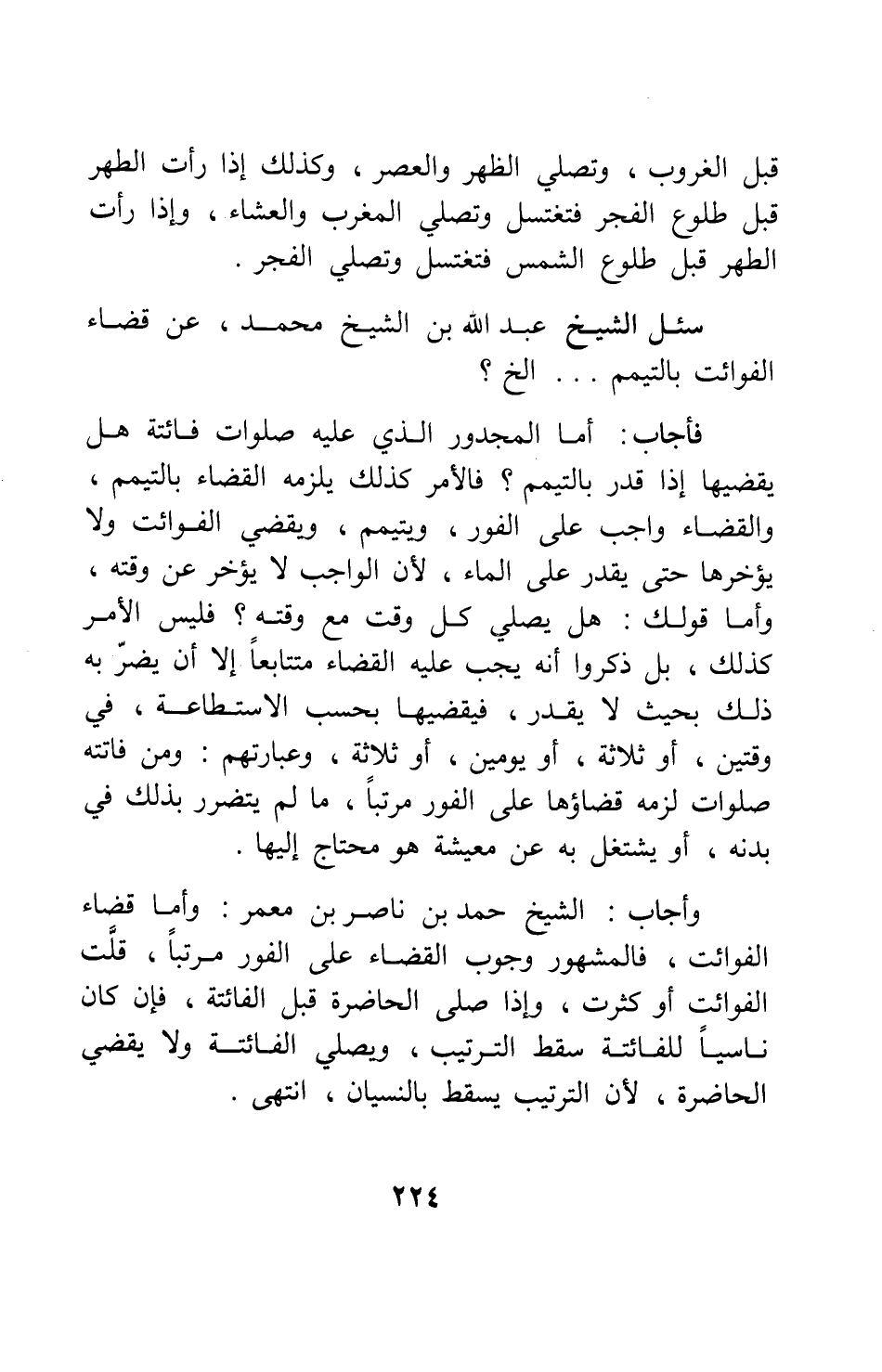 وأجاب الشيخ حمد بن ناصر بن معمر: وأما قضاء الفوائت، فالمشهور وجوب القضاء على الفور مرتباً، قَلَّتِ الفوائت أو كثرت. وإذا صلى الحاضرة قبل الفائتة، فإن كان ناسياً للفائتة سقط الترتيب، ويصلي الفائتة ولا يقضي الحاضرة، لأن الترتيب يسقط بالنسيان. انتهى.