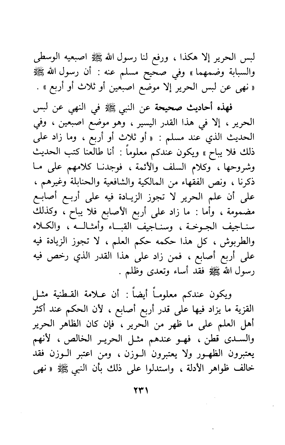 فهذه أحاديث صحيحة عن النبي صلى الله عليه وسلم في النهي عن لبس الحرير، إلا في هذا القدر اليسير، وهو موضع إصبعين، وفي الحديث الذي عند مسلم: " أو ثلاث أو أربع "، وما زاد على ذلك فلا يباح 3. ويكون عندكم معلوماً: أنا طالعنا كتب الحديث وشروحها، وكلام السلف والأئمة، فوجدنا كلامهم على ما ذكرنا.