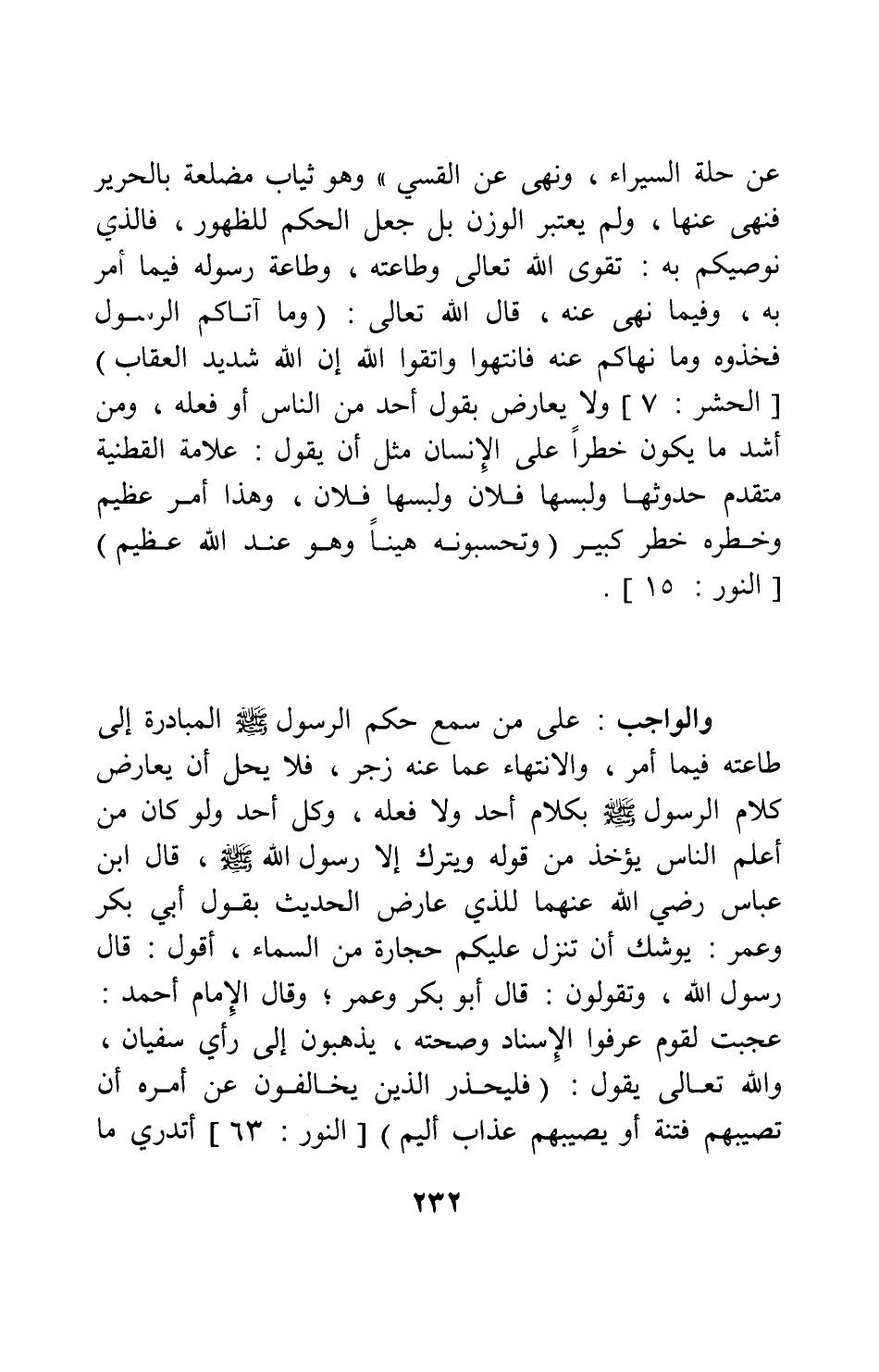 عن حلة السيراء، ونهى عن القسي " 1 وهو ثياب مضلعة بالحرير فنهى عنها، ولم يعتبر الوزن بل جعل الحكم للظهور. فالذي نوصيكم به: تقوى الله تعالى وطاعته، وطاعة رسوله فيما أمر به، وفيما نهى عنه؛ قال الله تعالى: {وَمَا آتَاكُمُ الرَّسُولُ فَخُذُوهُ وَمَا نَهَاكُمْ عَنْهُ فَانْتَهُوا وَاتَّقُوا اللَّهَ إِنَّ اللَّهَ شَدِيدُ الْعِقَابِ} [سورة الحشر آية: 7] ، ولا يعارض بقول أحد من الناس أو فعله. ومن أشد ما يكون خطراً على الإنسان مثل أن يقول: علامة القطنية متقدم حدوثها ولبسها فلان ولبسها فلان؛ وهذا أمر عظيم وخطره خطر كبير، {وَتَحْسَبُونَهُ هَيِّناً وَهُوَ عِنْدَ اللَّهِ عَظِيمٌ} [سورة النور آية: 15] .