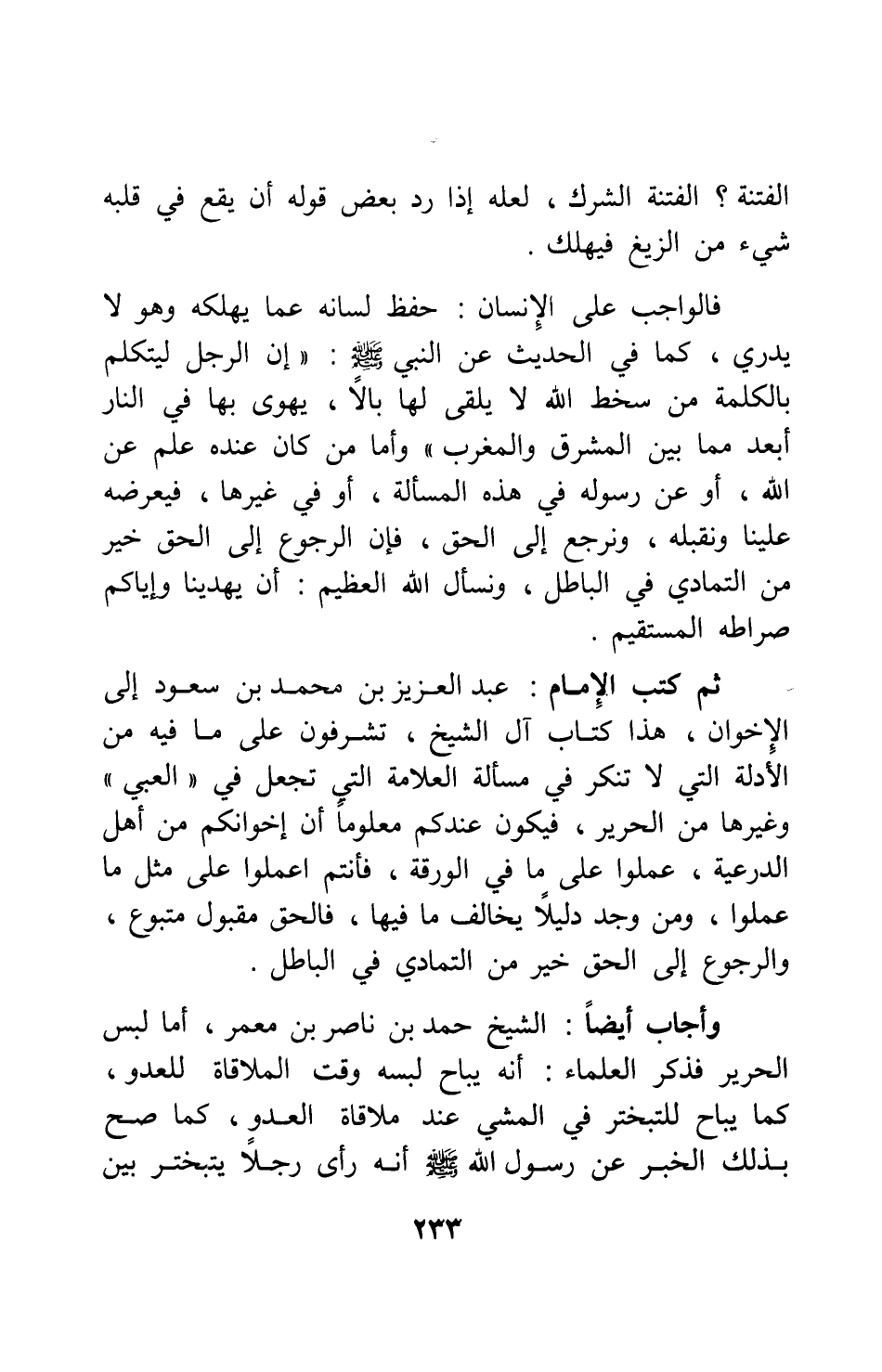 ثم كتب الإمام عبد العزيز بن محمد بن سعود إلى الإخوان: هذا كتاب آل الشيخ، تشرفون على ما فيه من الأدلة التي لا تنكر في مسألة العلامة التي تجعل في العبي وغيرها من الحرير، فيكون عندكم معلوماً أن إخوانكم من أهل الدرعية، عملوا على ما في الورقة، فأنتم اعملوا على مثل ما عملوا؛ ومن وجد دليلاً يخالف ما فيها، فالحق مقبول متبوع، والرجوع إلى الحق خير من التمادي في الباطل.