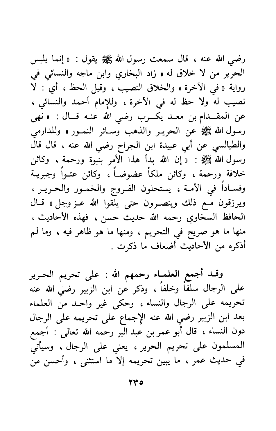 رضي الله عنه قال: سمعت رسول الله صلى الله عليه وسلم يقول: " إنما يلبس الحرير من لا خلاق له " 1، زاد البخاري وابن ماجة والنسائي في رواية: " في الآخرة "، والخلاق: النصيب، وقيل: الحظ، أي: لا نصيب له ولا حظ له في الآخرة. وللإمام أحمد والنسائي، عن المقدام بن معد يكرب رضي الله عنه قال: " نهى رسول الله صلى الله عليه وسلم عن الحرير والذهب وسائر النمور " 2. وللدارمي والطيالسي عن أبي عبيدة ابن الجراح رضي الله عنه قال: قال رسول الله صلى الله عليه وسلم: " إن الله بدأ هذا الأمر بنبوة ورحمة، وكائن خلافة ورحمة، وكائن ملكاً عضوضاً، وكائن عتواً وجبرية وفساداً في الأمة، يستحلون الفروج والخمور والحرير، ويرزقون مع ذلك وينصرون حتى يلقوا الله عز وجل "، قال الحافظ السخاوي، رحمه الله: حديث حسن. فهذه الأحاديث، منها ما هو صريح في التحريم، ومنها ما هو ظاهر فيه؛ وما لم أذكره من الأحاديث أضعاف ما ذكرت.