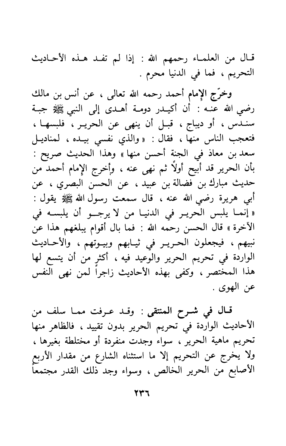 وخرج الإمام أحمد، رحمه الله تعالى، عن أنس بن مالك رضي الله عنه " أن أكيدر دومة أهدى إلى النبي صلى الله عليه وسلم جبة سندس أو ديباج - قبل أن ينهى عن الحرير - فلبسها، فتعجب الناس منها، فقال: والذي نفسي بيده، لمناديل سعد بن معاذ في الجنة أحسن منها " 1، وهذا الحديث صريح بأن الحرير قد أبيح أولاً ثم نهي عنه. وأخرج الإمام أحمد من حديث مبارك بن فضالة بن عبيد، عن الحسن البصري، عن أبي هريرة رضي الله عنه قال: سمعت رسول الله صلى الله عليه وسلم يقول: " إنما يلبس الحرير في الدنيا من لا يرجو أن يلبسه في الآخرة " 2؛ قال الحسن، رحمه الله: "فما بال أقوام يبلغهم هذا عن نبيهم، فيجعلون الحرير في ثيابهم وبيوتهم ". والأحاديث الواردة في تحريم الحرير والوعيد فيه أكثر من أن يتسع لها هذا المختصر، وكفى بهذه الأحاديث زاجراً لمن نهى النفس عن الهوى.
