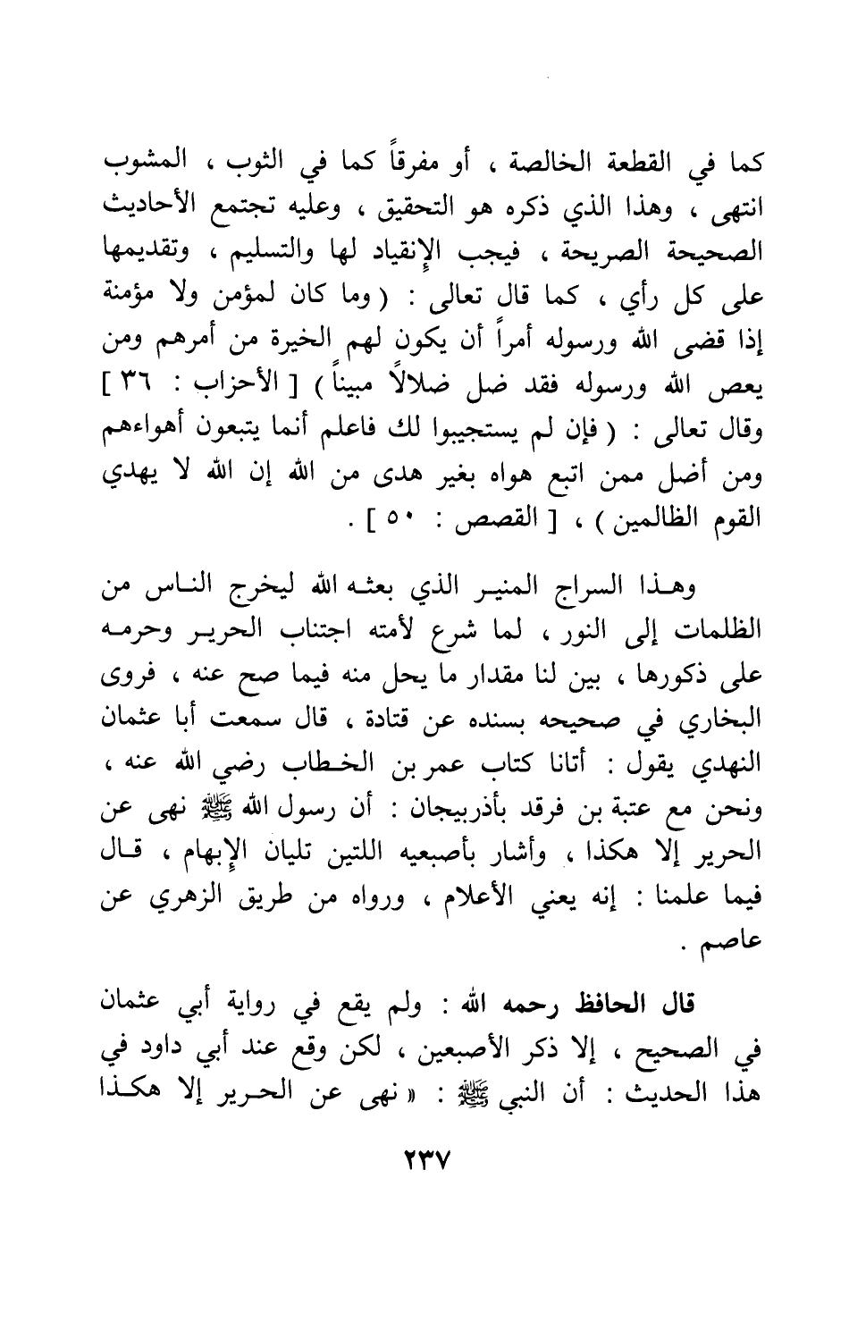 وهذا السراج المنير الذي بعثه الله ليخرج الناس من الظلمات إلى النور، لما شرع لأمته اجتناب الحرير وحرمه على ذكورها، بين لنا مقدار ما يحل منه فيما صح عنه؛ فروى البخاري في صحيحه بسنده عن قتادة، قال: سمعت أبا عثمان النهدي يقول: أتانا كتاب عمر بن الخطاب رضي الله عنه ونحن مع عتبة بن فرقد بأذربيجان: "أن رسول الله صلى الله عليه وسلم نهى عن الحرير إلا هكذا، وأشار بإصبعيه اللتين تليان الإبهام " 1، قال: فيما علمنا، إنه يعني الأعلام، ورواه من طريق الزهري عن عاصم.