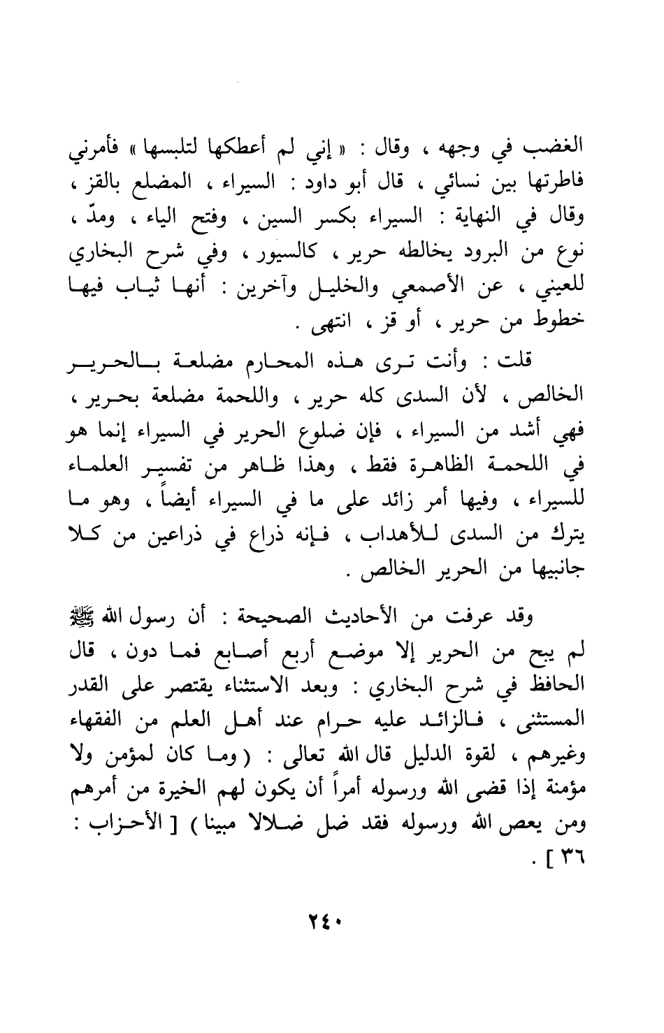 وقد عرفت من الأحاديث الصحيحة: أن رسول الله صلى الله عليه وسلم لم يبح من الحرير إلا موضع أربع أصابع فما دون، قال الحافظ في شرح البخاري: وبعد الاستثناء يقتصر على القدر المستثنى، فالزائد عليه حرام عند أهل العلم من الفقهاء وغيرهم، لقوة الدليل قال الله تعالى: {وَمَا كَانَ لِمُؤْمِنٍ وَلا مُؤْمِنَةٍ إِذَا قَضَى اللَّهُ وَرَسُولُهُ أَمْراً أَنْ يَكُونَ لَهُمُ الْخِيَرَةُ مِنْ أَمْرِهِمْ وَمَنْ يَعْصِ اللَّهَ وَرَسُولَهُ فَقَدْ ضَلَّ ضَلالاً مُبِيناً} [سورة الأحزاب آية: 36] .