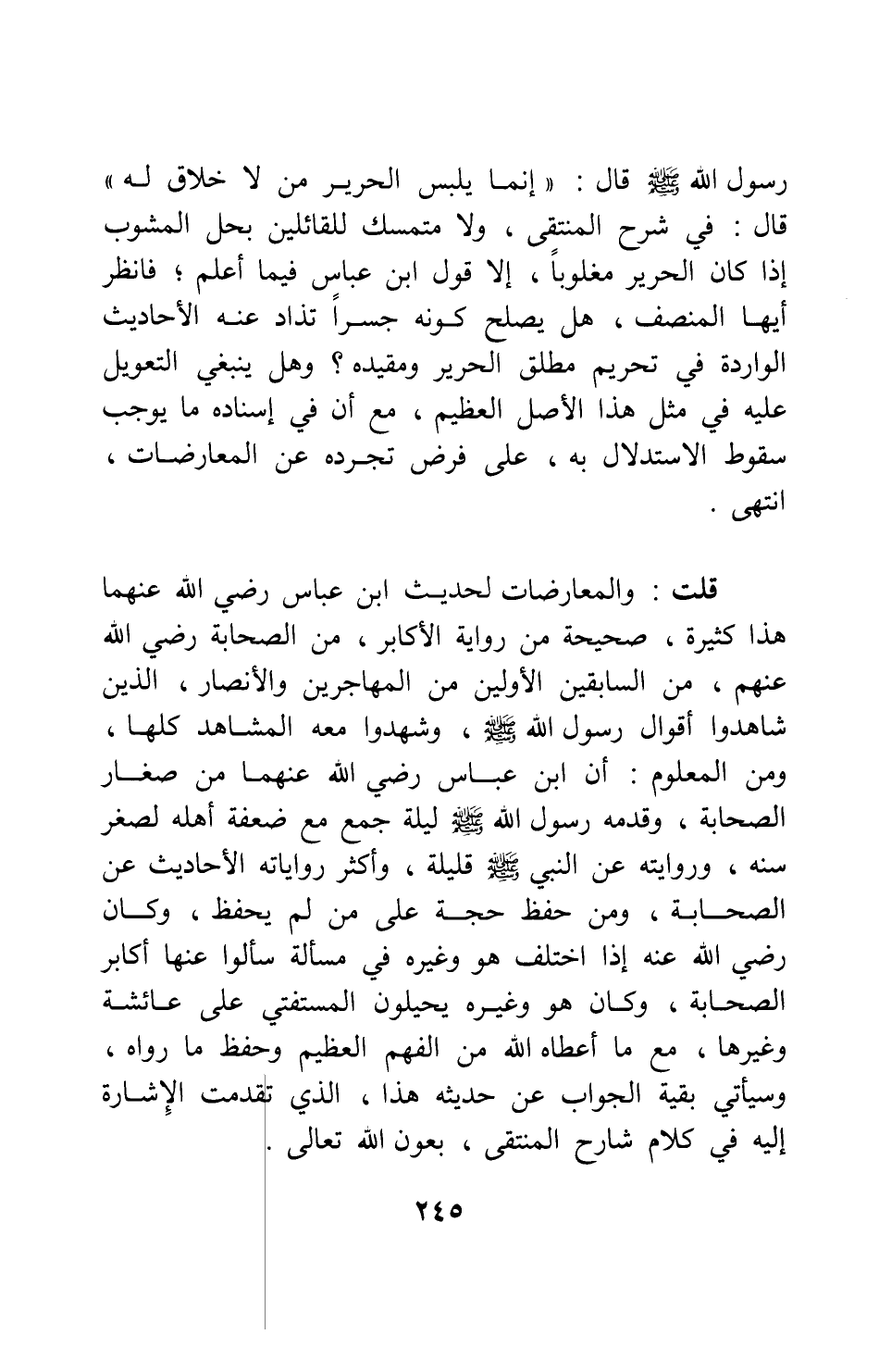 قلت: والمعارضات لحديث ابن عباس، رضي الله عنهما، هذا كثيرة، صحيحة من رواية الأكابر من الصحابة، رضي الله عنهم، من السابقين الأولين من المهاجرين والأنصار، الذين شاهدوا أقوال رسول الله صلى الله عليه وسلم وشهدوا معه المشاهد كلها. ومن المعلوم: أن ابن عباس، رضي الله عنهما، من صغار الصحابة، وقدمه رسول الله صلى الله عليه وسلم ليلة جمع مع ضعفه أهله لصغر سنه، وروايته عن النبي صلى الله عليه وسلم قليلة، وأكثر رواياته الأحاديث عن الصحابة، ومن حفظ حجة على من لم يحفظ. وكان رضي الله عنه إذا اختلف هو وغيره في مسألة سألوا عنها أكابر الصحابة، وكان هو وغيره يحيلون المستفتي على عائشة وغيرها، مع ما أعطاه الله من الفهم العظيم وحفظ ما رواه. وسيأتي بقية الجواب عن حديثه هذا، الذي تقدمت الإشارة إليه في كلام شارح المنتقى، بعون الله تعالى.