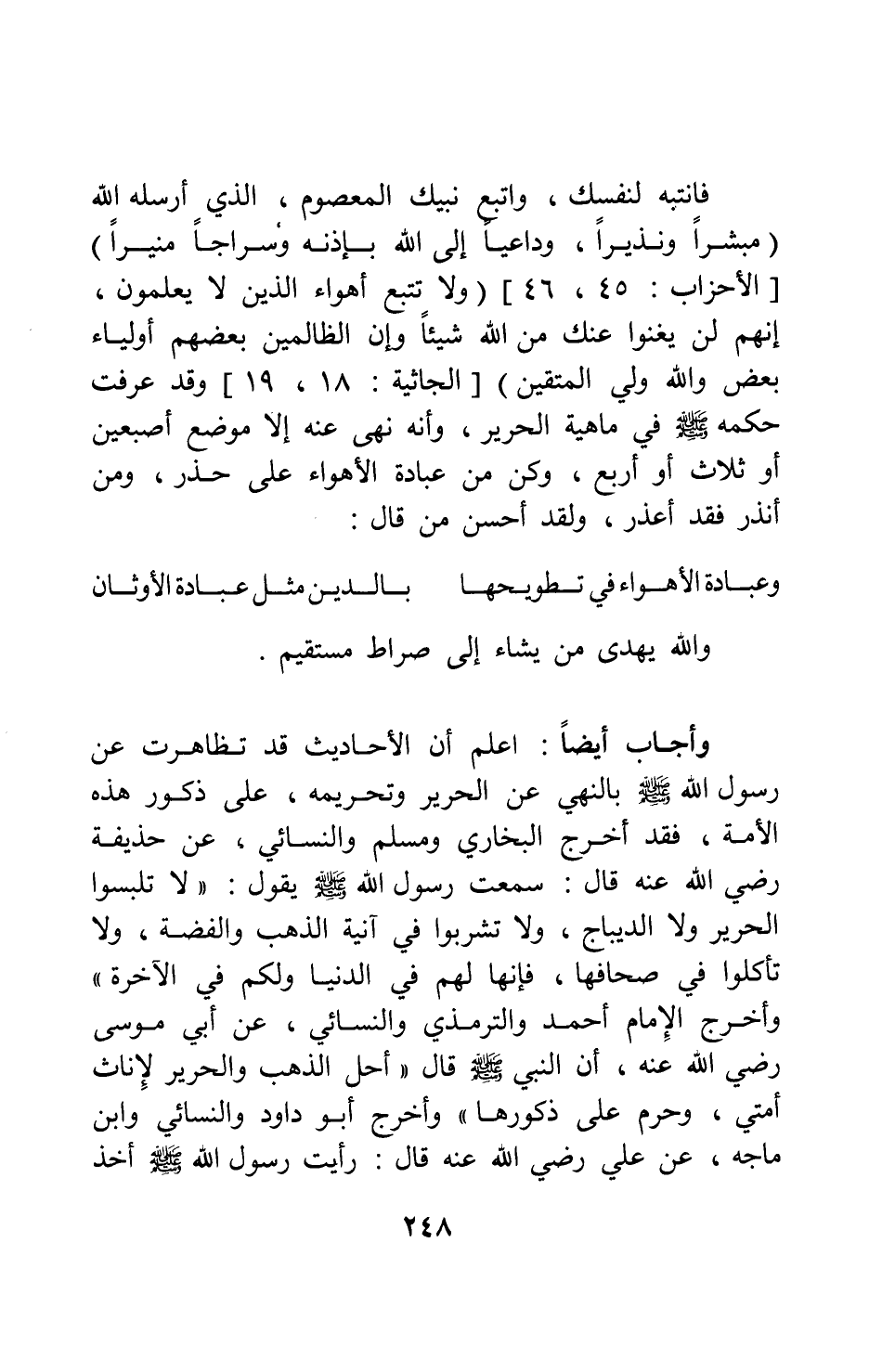 فانتبه لنفسك، واتبع نبيك المعصوم، الذي أرسله الله: {مُبَشِّراً وَنَذِيراً وَدَاعِياً إِلَى اللَّهِ بِإِذْنِهِ وَسِرَاجاً مُنِيراً} [سورة الأحزاب آية: 45-46] ، {وَلا تَتَّبِعْ أَهْوَاءَ الَّذِينَ لا يَعْلَمُونَ إِنَّهُمْ لَنْ يُغْنُوا عَنْكَ مِنَ اللَّهِ شَيْئاً وَإِنَّ الظَّالِمِينَ بَعْضُهُمْ أَوْلِيَاءُ بَعْضٍ وَاللَّهُ وَلِيُّ الْمُتَّقِينَ} [سورة الجاثية آية: 18-19] . وقد عرفت حكمه صلى الله عليه وسلم في ماهية الحرير، وأنه نهى عنه إلا موضع أصبعين أو ثلاث أو أربع، وكن من عبادة الأهواء على حذر، ومن أنذر فقد أعذر، ولقد أحسن من قال: