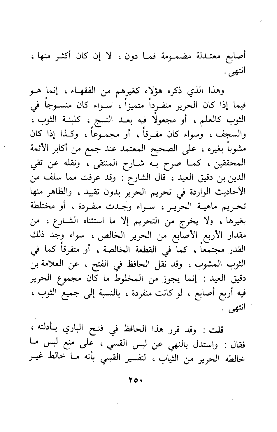 وهذا الذي ذكره هؤلاء كغيرهم من الفقهاء، إنما هو فيما إذا كان الحرير منفرداً متميزاً، سواء كان منسوجاً في الثوب كالعلم، أو مجعولاً فيه بعد النسج، كلبنة الثوب، والسجف، وسواء كان مفرقاً، أو مجموعاً، وكذا إذا كان مشوباً بغيره، على الصحيح المعتمد عند جمع من أكابر الأئمة المحققين، كما صرح به شارح المنتقى، ونقله عن تقي الدين بن دقيق العيد. قال الشارح: وقد عرفت مما سلف من الأحاديث الواردة في تحريم الحرير بدون تقييد، والظاهر منها تحريم ماهية الحرير، سواء وجدت منفردة، أو مختلطة بغيرها، ولا يخرج من التحريم إلا ما استثناه الشارع، من مقدار الأربع الأصابع من الحرير الخالص، سواء وجد ذلك القدر مجتمعاً، كما في القطعة الخالصة، أو متفرقاً كما في الثوب المشوب. وقد نقل الحافظ في الفتح، عن العلامة ابن دقيق العيد: إنما يجوز من المخلوط ما كان مجموع الحرير فيه أربع أصابع، لو كانت منفردة، بالنسبة إلى جميع الثوب. انتهى.