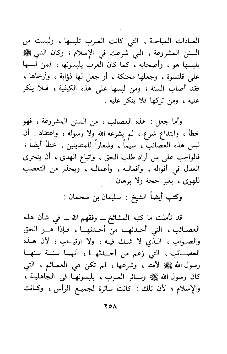 وكتب أيضا: ً الشيخ سليمان بن سحمان: قد تأملت ما كتبه المشائخ - وفقهم الله - في شأن هذه العصائب، التي أحدثها من أحدثها، فإذا هو الحق والصواب، الذي لا شك فيه ولا ارتياب، لأن هذه العصائب التي زعم من أحدثها أنها سنة سنها رسول الله صلى الله عليه وسلم لأمته وشرعها، لم تكن هي العمائم التي كان رسول الله صلى الله عليه وسلم وسائر العرب يلبسونها في الجاهلية والإسلام، لأن تلك كانت ساترة لجميع الرأس، وكانت