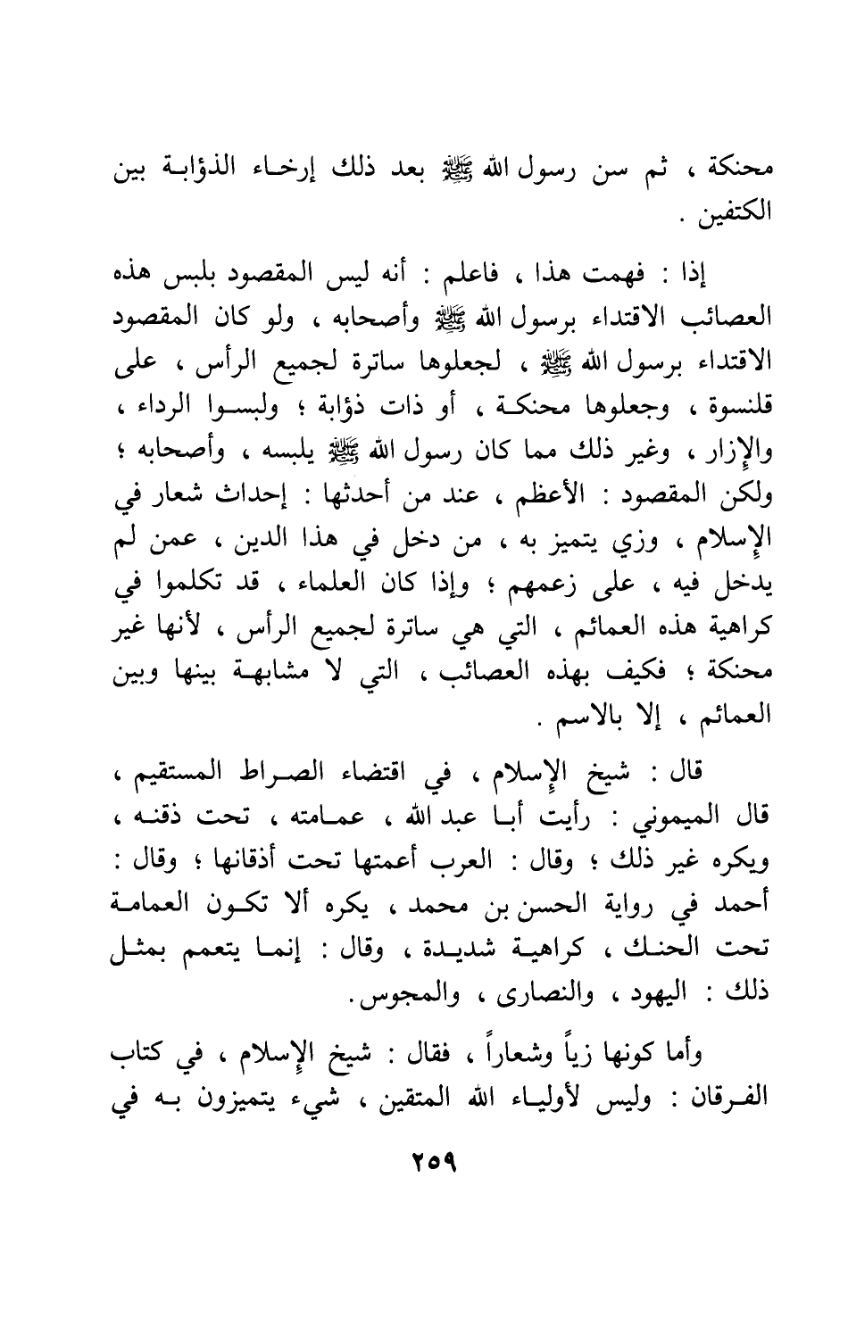 قال: شيخ الإسلام، في اقتضاء الصراط المستقيم: قال الميموني: رأيت أبا عبد الله، عمامته، تحت ذقنه، ويكره غير ذلك، وقال: العرب أعمتها تحت أذقانها; وقال أحمد في رواية الحسن بن محمد: يكره ألا تكون العمامة تحت الحنك كراهية شديدة، وقال: إنما يتعمم بمثل ذلك: اليهود، والنصارى، والمجوس.