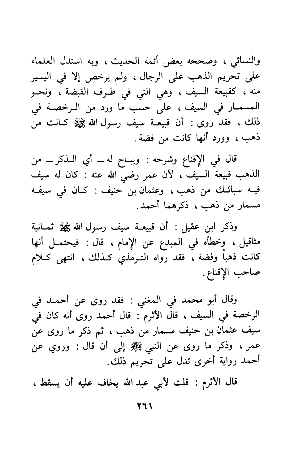 وقال أبو محمد في المغني: فقد روي عن أحمد في الرخصة في السيف، قال الأثرم: قال أحمد: روي أنه كان في سيف عثمان بن حنيف مسمار من ذهب، ثم ذكر ما روي عن عمر، وذكر ما روي عن النبي صلى الله عليه وسلم - إلى أن قال - وروي عن أحمد رواية أخرى تدل على تحريم ذلك.