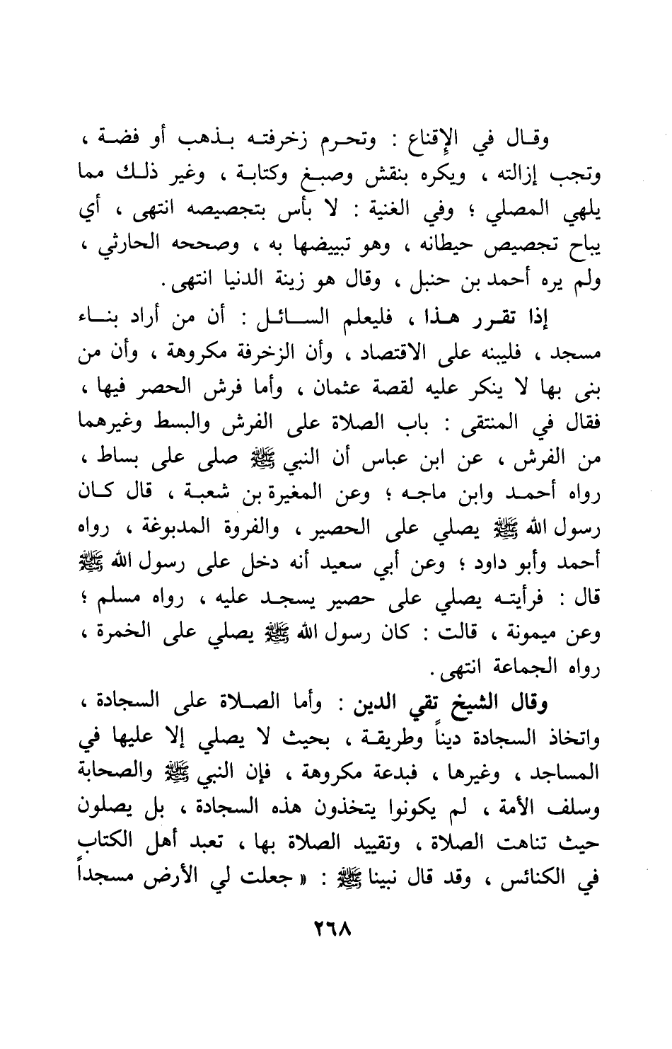 وقال الشيخ تقي الدين: وأما الصلاة على السجادة، واتخاذ السجادة ديناً وطريقة، بحيث لا يصلي إلا عليها في المساجد وغيرها، فبدعة مكروهة؛ فإن النبي صلى الله عليه وسلم والصحابة وسلف الأمة، لم يكونوا يتخذون هذه السجادة، بل يصلون حيث تناهت الصلاة؛ وتقييد الصلاة بها، تعبد أهل الكتاب في الكنائس، وقد قال نبينا صلى الله عليه وسلم: " جعلت لي الأرض مسجداً