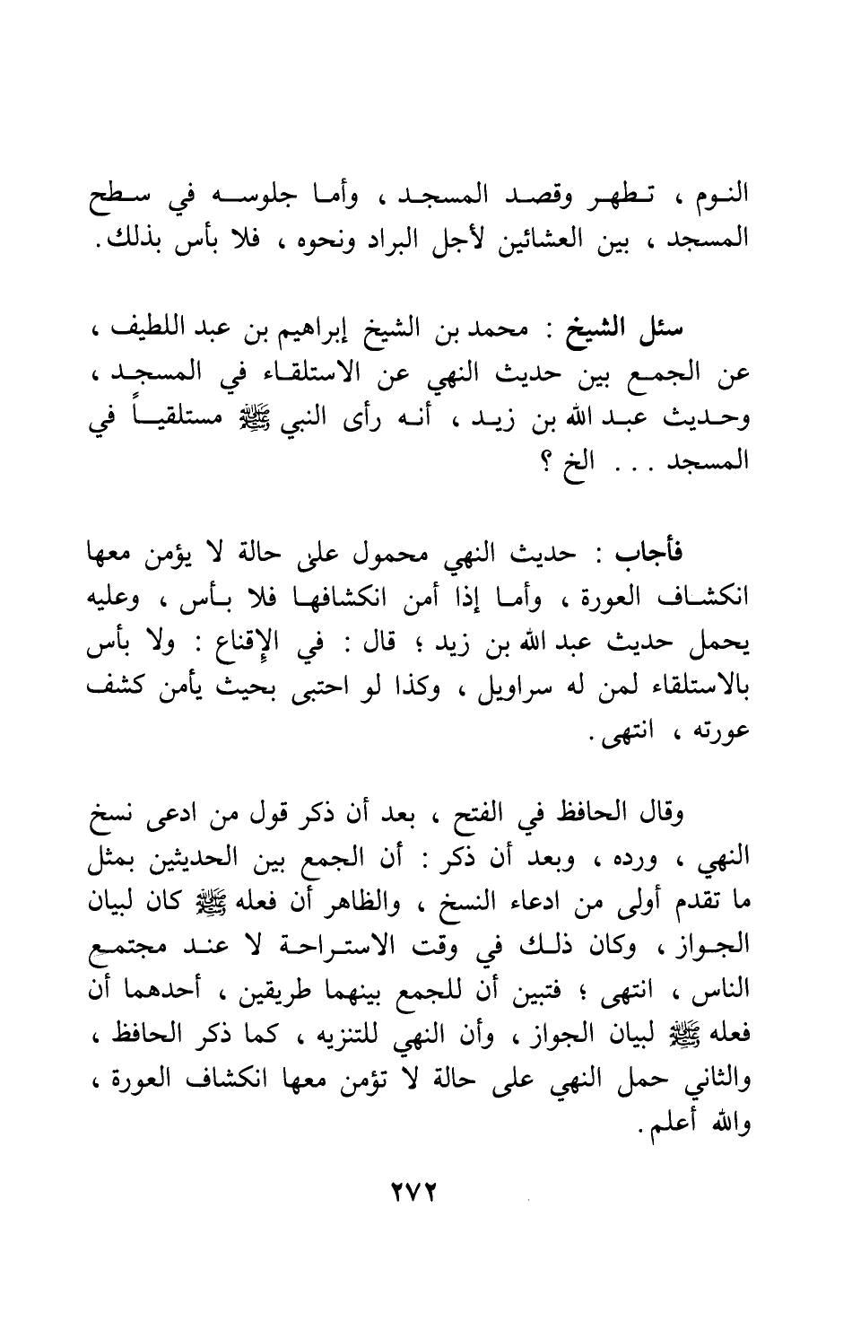 فأجاب: حديث النهي محمول على حالة لا يأمن معها انكشاف العورة، وأما إذا أمن انكشافها فلا بأس؛ وعليه يحمل حديث عبد الله بن زيد، قال: في الإقناع: ولا بأس بالاستلقاء لمن له سراويل، وكذا لو احتبى بحيث يأمن كشف عورته. انتهى.