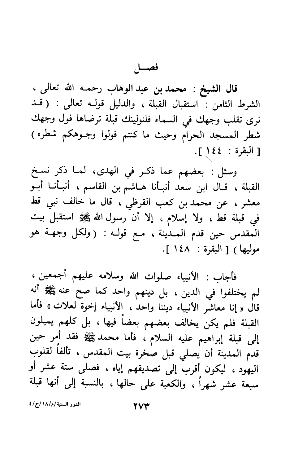 قال الشيخ: محمد بن عبد الوهاب، رحمه الله تعالى: الشرط الثامن: استقبال القبلة، والدليل قوله تعالى: {قَدْ نَرَى تَقَلُّبَ وَجْهِكَ فِي السَّمَاءِ فَلَنُوَلِّيَنَّكَ قِبْلَةً تَرْضَاهَا فَوَلِّ وَجْهَكَ شَطْرَ الْمَسْجِدِ الْحَرَامِ وَحَيْثُ مَا كُنْتُمْ فَوَلُّوا وُجُوهَكُمْ} [سورة البقرة آية: 144] .