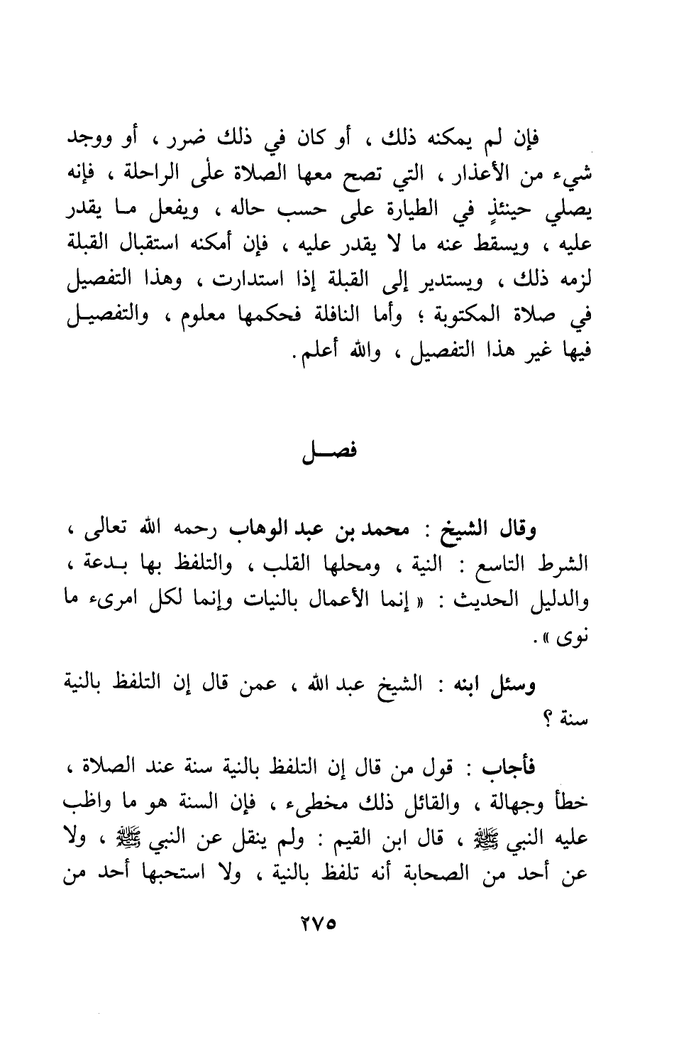 وقال الشيخ محمد بن عبد الوهاب، رحمه الله تعالى: الشرط التاسع: النية، ومحلها القلب، والتلفظ بها بدعة؛ والدليل: الحديث: " إنما الأعمال بالنيات، وإنما لكل امرئ ما نوى " 1.