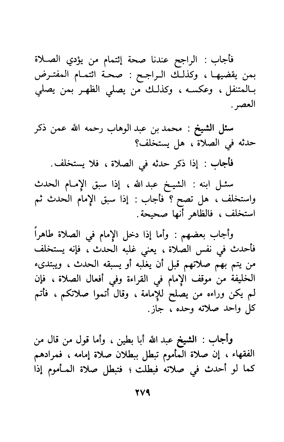 سئل الشيخ محمد بن عبد الوهاب، رحمه الله: عمن ذكر حدثه في الصلاة، هل يستخلف؟