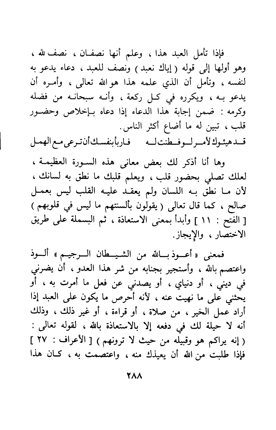 وها أنا أذكر لك بعض معاني هذه السورة العظيمة، لعلك تصلي بحضور قلب، ويعلم قلبك ما نطق به لسانك، لأن ما نطق به اللسان ولم يعقد عليه القلب ليس بعمل صالح، كما قال تعالى {يَقُولُونَ بِأَلْسِنَتِهِمْ مَا لَيْسَ فِي قُلُوبِهِمْ} [سورة الفتح آية: 11] . وأبدأ بمعنى الاستعاذة، ثم البسملة، على طريق الاختصار والإيجاز.