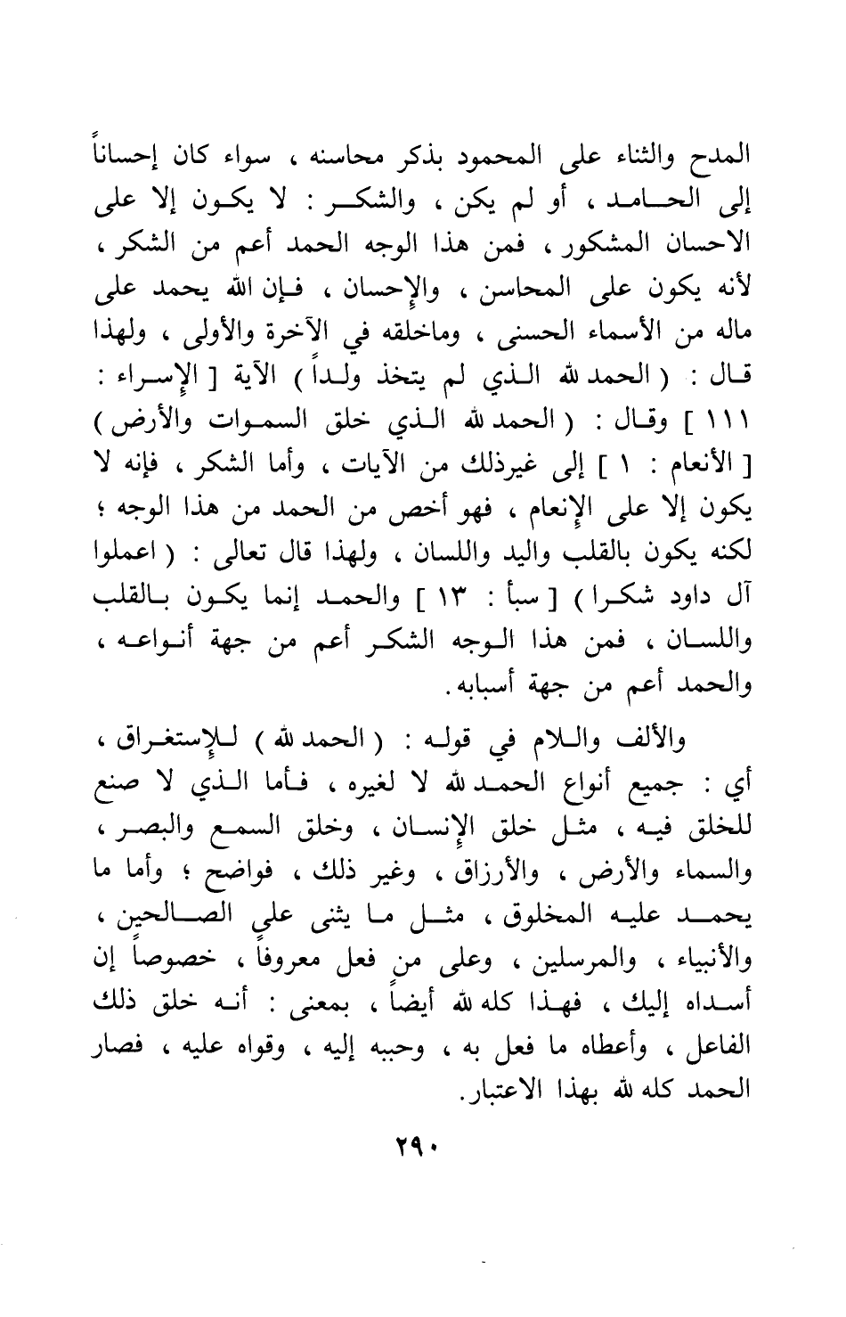 المدح والثناء على المحمود بذكر محاسنه، سواء كان إحساناً إلى الحامد أو لم يكن، والشكر لا يكون إلا على إحسان المشكور؛ فمن هذا الوجه الحمد أعم من الشكر، لأنه يكون على المحاسن، والإحسان؛ فإن الله يحمد على ما له من الأسماء الحسنى، وما خلقه في الآخرة والأولى، ولهذا قال: {الْحَمْدُ لِلَّهِ الَّذِي لَمْ يَتَّخِذْ وَلَداً} الآية [سورة الإسراء آية: 111] ، قال: {الْحَمْدُ لِلَّهِ الَّذِي خَلَقَ السَّمَاوَاتِ وَالأَرْضَ} [سورة الأنعام آية: 1] إلى غير ذلك من الآيات. وأما الشكر، فإنه لا يكون إلا على الإنعام، فهو أخص من الحمد من هذا الوجه، لكنه يكون بالقلب واليد واللسان، ولهذا قال تعالى: {اعْمَلُوا آلَ دَاوُدَ شُكْراً} [سورة سبأ آية: 13] ، والحمد إنما يكون بالقلب واللسان؛ فمن هذا الوجه الشكر أعم من جهة أنواعه، والحمد أعم من جهة أسبابه.