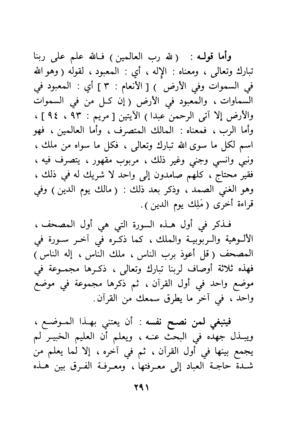 وأما قوله: {لِلَّهِ رَبِّ الْعَالَمِينَ} [سورة الفاتحة آية: 2] ، فالله: علَمٌ على ربنا تبارك وتعالى، ومعناه: الإله، أي: المعبود، لقوله: {وَهُوَ اللَّهُ فِي السَّمَاوَاتِ وَفِي الأَرْضِ} [سورة الأنعام آية: 3] ، أي: المعبود في السماوات، والمعبود في الأرض، {إِنْ كُلُّ مَنْ فِي السَّمَاوَاتِ وَالأَرْضِ إِلاَّ آتِي الرَّحْمَنِ عَبْداً} [سورة مريم آية: 93] الآيتين. وأما الرب، فمعناه: المالك المتصرف. وأما العالمين، فهو: اسم لكل ما سوى الله تبارك وتعالى، فكل ما سواه من ملك، ونبي، وإنسي، وجني، وغير ذلك، مربوب مقهور، يتصرف فيه، فقير محتاج؛ كلهم صامدون إلى واحد لا شريك له في ذلك، وهو الغني الصمد. وذكر بعد ذلك: {مَالِكِ يَوْمِ الدِّينِ} [سورة الفاتحة آية: 4] ، وفي قراءة أخرى: {مَلِكِ يَوْمِ الدِّينِ}