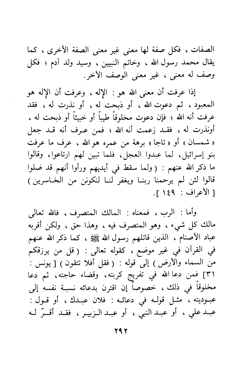 إذا عرفت أن معنى الله هو: الإله، وعرفت أن الإله هو: المعبود، ثم دعوت الله، أو ذبحت له، أو نذرت له، فقد عرفت أنه الله، فإن دعوت مخلوقاً طيباً أو خبيثاً، أو ذبحت له، أو نذرت له، فقد زعمت أنه الله; فمن عرف أنه قد جعل "شمسان" أو "تاجاً" برهة من عمره هو الله، عرف ما عرفت بنو إسرائيل لما عبدوا العجل، فلما تبين لهم ارتاعوا، وقالوا ما ذكر الله عنهم: {وَلَمَّا سُقِطَ فِي أَيْدِيهِمْ وَرَأَوْا أَنَّهُمْ قَدْ ضَلُّوا قَالُوا لَئِنْ لَمْ يَرْحَمْنَا رَبُّنَا وَيَغْفِرْ لَنَا لَنَكُونَنَّ مِنَ الْخَاسِرِينَ} [سورة الأعراف آية: 149] .