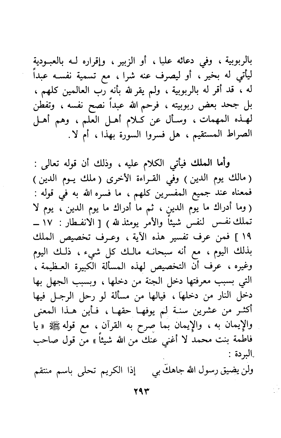 وأما الملك فيأتي الكلام عليه، وذلك أن قوله تعالى: {مَالِكِ يَوْمِ الدِّينِ} [سورة الفاتحة آية: 4] ، وفي القراءة الأخرى: {مَلِكِ يَوْمِ الدِّينِ} فمعناه عند جميع المفسرين كلهم، ما فسره الله به في قوله: {وَمَا أَدْرَاكَ مَا يَوْمُ الدِّينِ ثُمَّ مَا أَدْرَاكَ مَا يَوْمُ الدِّينِ يَوْمَ لا تَمْلِكُ نَفْسٌ لِنَفْسٍ شَيْئاً وَالأَمْرُ يَوْمَئِذٍ لِلَّهِ} [سورة الانفطار آية: 17-19] . فمن عرف تفسير هذه الآية، وعرف تخصيص الملك بذلك اليوم، مع أنه سبحانه مالك كل شيء، ذلك اليوم وغيره، عرف أن التخصيص لهذه المسألة الكبيرة العظيمة، التي بسبب معرفتها دخل الجنة من دخلها، وبسبب الجهل بها دخل النار من دخلها.