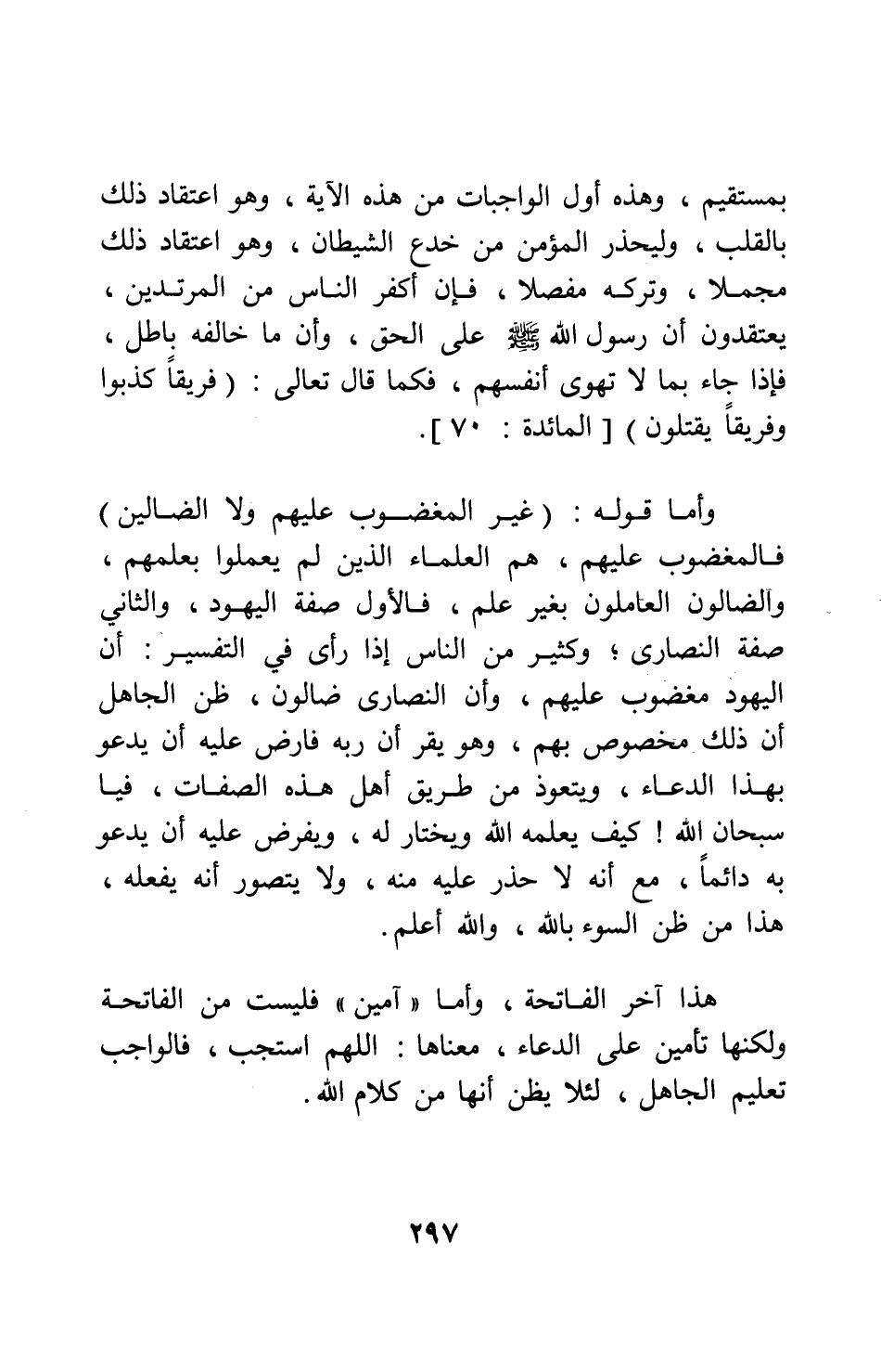 وأما قوله: {غَيْرِ الْمَغْضُوبِ عَلَيْهِمْ وَلا الضَّالِّينَ} [سورة الفاتحة آية: 7] ، فالمغضوب عليهم هم: العلماء الذين لم يعملوا بعلمهم، والضالون: العاملون بغير علم؛ فالأول صفة اليهود، والثاني صفة النصارى. وكثير من الناس إذا رأى في التفسير: أن اليهود مغضوب عليهم، وأن النصارى ضالون، ظن الجاهل أن ذلك مخصوص بهم، وهو يقر أن ربه فارض عليه أن يدعو بهذا الدعاء، ويتعوذ من طريق أهل هذه الصفات، فيا سبحان الله! كيف يعلمه الله ويختار له، ويفرض عليه أن يدعو به دائماً، مع أنه لا حذر عليه منه، ولا يتصور أنه يفعله؛ هذا من ظن السوء بالله، والله أعلم.