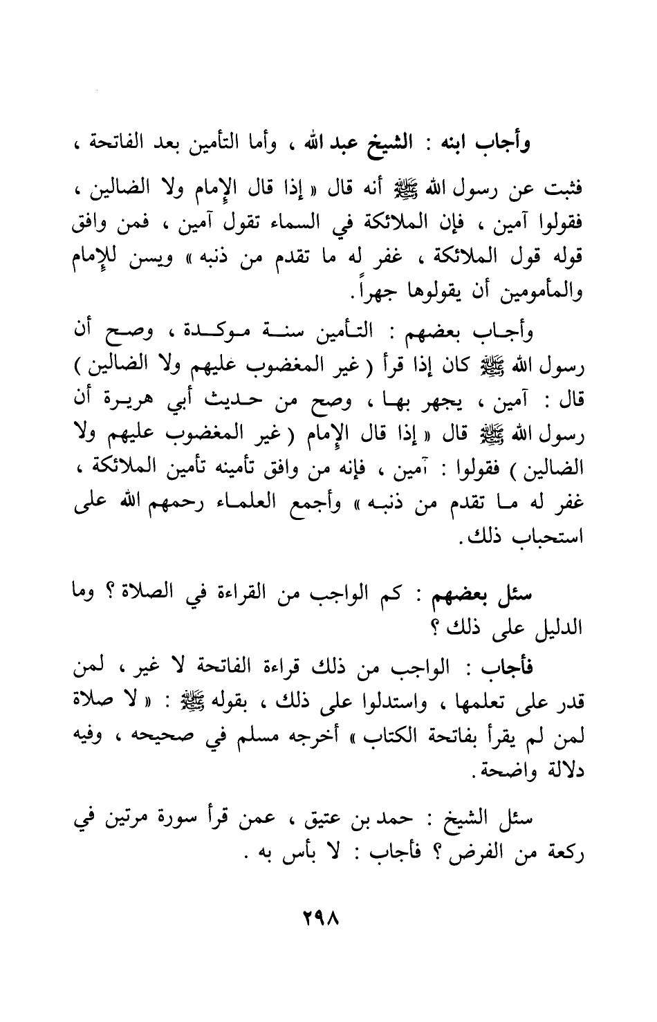 وأجاب ابنه: الشيخ عبد الله: وأما التأمين بعد الفاتحة، فثبت عن رسول الله صلى الله عليه وسلم أنه قال: " إذا قال الإمام: {غَيْرِ الْمَغْضُوبِ عَلَيْهِمْ وَلا الضَّالِّينَ} ، فقولوا: آمين؛ فإن الملائكة في السماء تقول: آمين. فمن وافق قوله قول الملائكة، غفر له ما تقدم من ذنبه " 1. ويسن للإمام والمأمومين أن يقولوها جهراً.