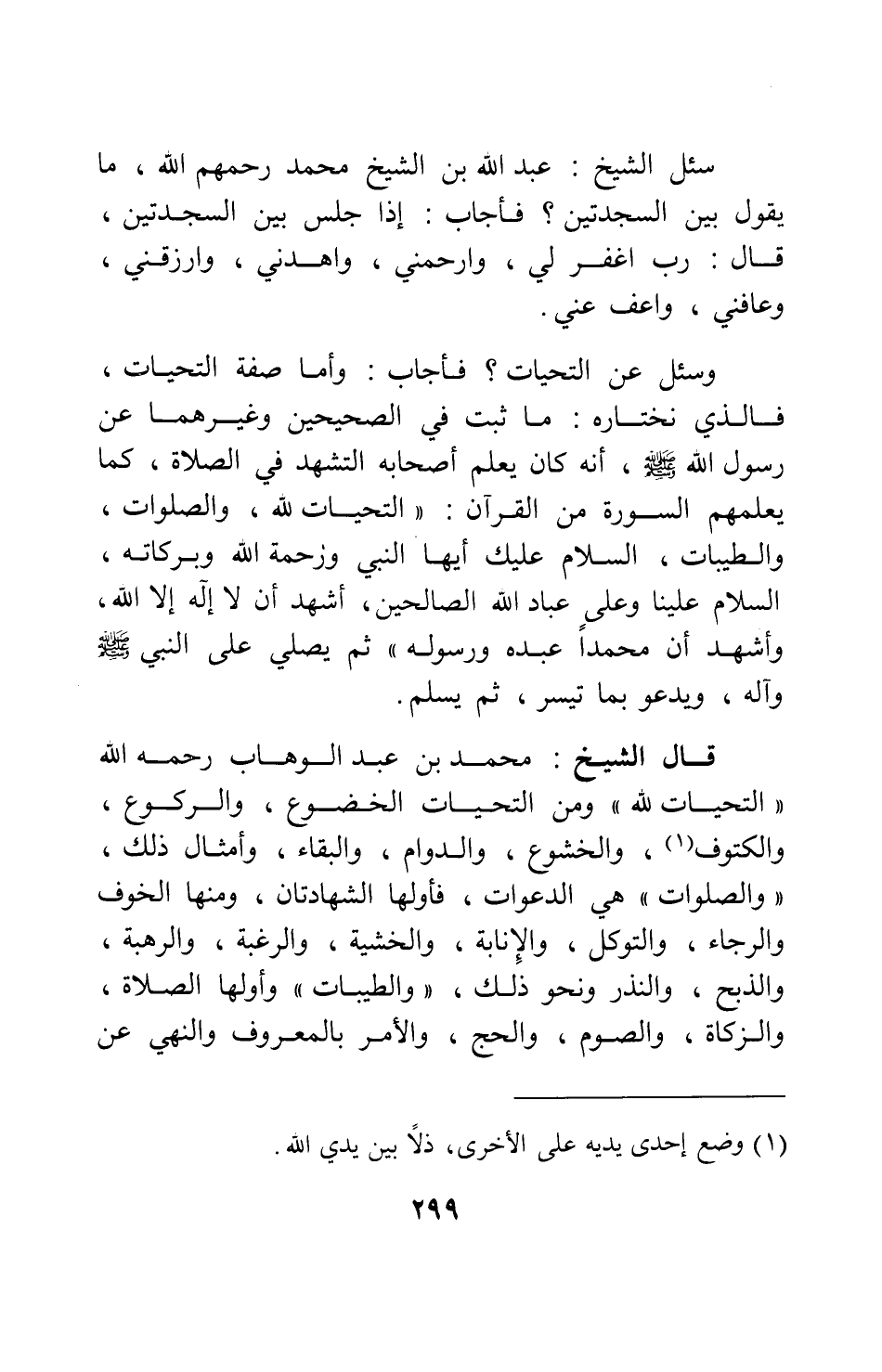 قال الشيخ محمد بن عبد الوهاب، رحمه الله: "التحيات لله "، ومن التحيات الخضوع، والركوع، والكتوف 2، والخشوع، والدوام، والبقاء، وأمثال ذلك، "والصلوات " هي: الدعوات؛ فأولها: الشهادتان، ومنها الخوف والرجاء، والتوكل، والإنابة، والخشية، والرغبة، والرهبة، والذبح، والنذر ونحو ذلك، "والطيبات " وأولها: الصلاة، والزكاة، والصوم، والحج، والأمر بالمعروف والنهي عن