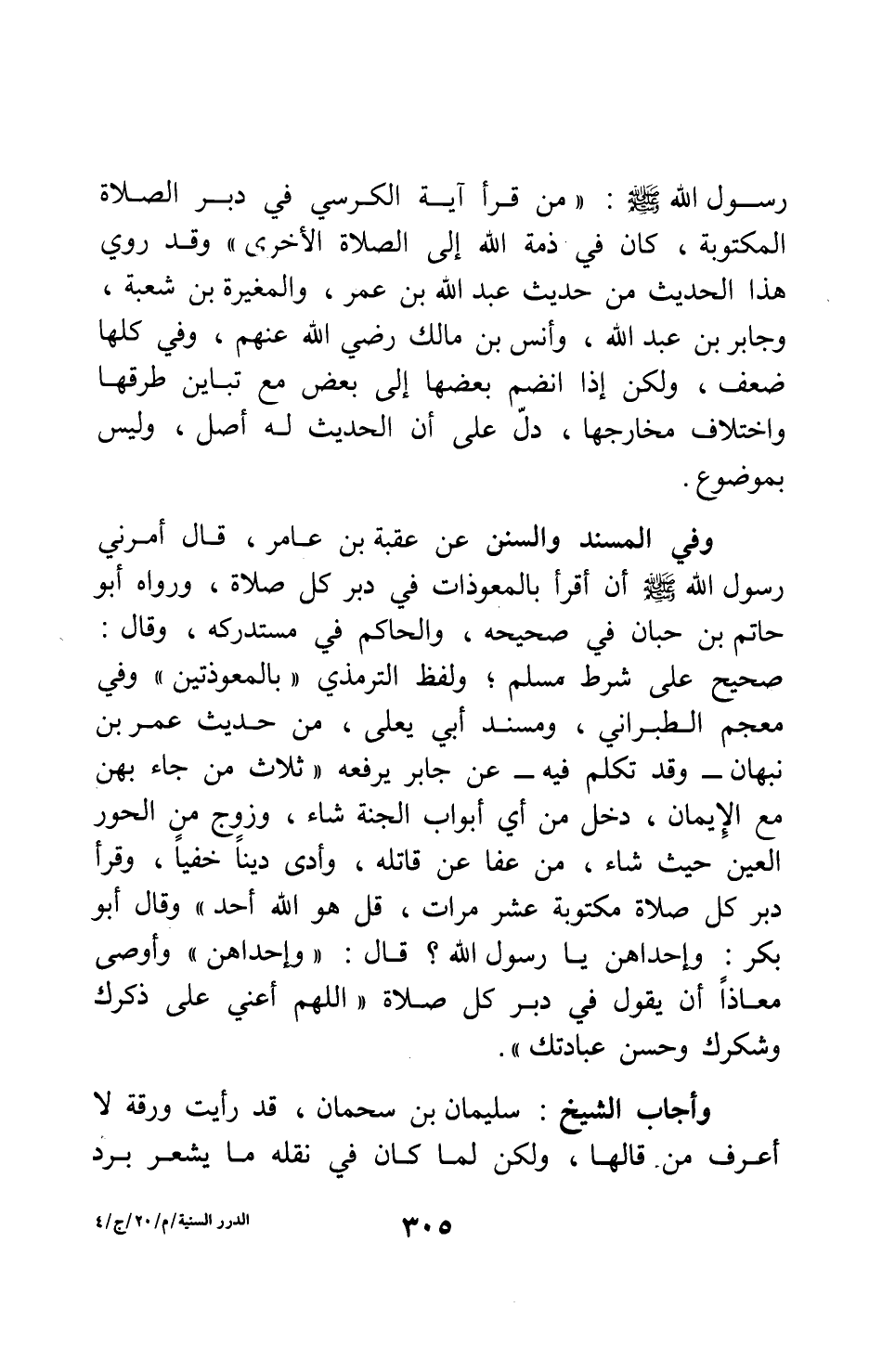 رسول الله صلى الله عليه وسلم: " من قرأ آية الكرسي في دبر الصلاة المكتوبة، كان في ذمة الله إلى الصلاة الأخرى ". وقد روي هذا الحديث من حديث عبد الله بن عمر، والمغيرة بن شعبة، وجابر بن عبد الله، وأنس بن مالك، رضي الله عنهم؛ وفي كلها ضعف، ولكن إذا انضم بعضها إلى بعض مع تباين طرقها واختلاف مخارجها، دل على أن الحديث له أصل، وليس بموضوع.
