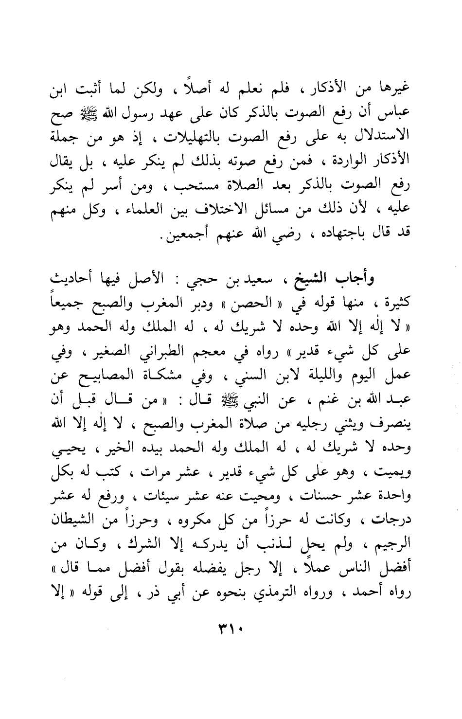 وأجاب الشيخ سعيد بن حجي: الأصل فيها أحاديث كثيرة، منها قوله في الحصن: ودبر المغرب والصبح جميعاً: " لا إله إلا الله وحده لا شريك له، له الملك وله الحمد وهو على كل شيء قدير " 1، رواه في معجم الطبراني الصغير، وفي عمل اليوم والليلة لابن السني. وفي مشكاة المصابيح عن عبد الله بن غنم، عن النبي صلى الله عليه وسلم قال: " من قال قبل أن ينصرف ويثني رجليه من صلاة المغرب والصبح: لا إله إلا الله وحده لا شريك له، له الملك وله الحمد، بيده الخير، يحيي ويميت، وهو على كل شيء قدير، عشر مرات، كتب له بكل واحدة عشر حسنات، ومحيت عنه عشر سيئات، ورفع له عشر درجات، وكانت له حرزاً من كل مكروه، وحرزاً من الشيطان الرجيم، ولم يحل لذنب أن يدركه إلا الشرك، وكان من أفضل الناس عملاً، إلا رجل يفضله بقول أفضل مما قال " 2، رواه أحمد، ورواه الترمذي بنحوه عن أبي ذر، إلى قوله: "إلا