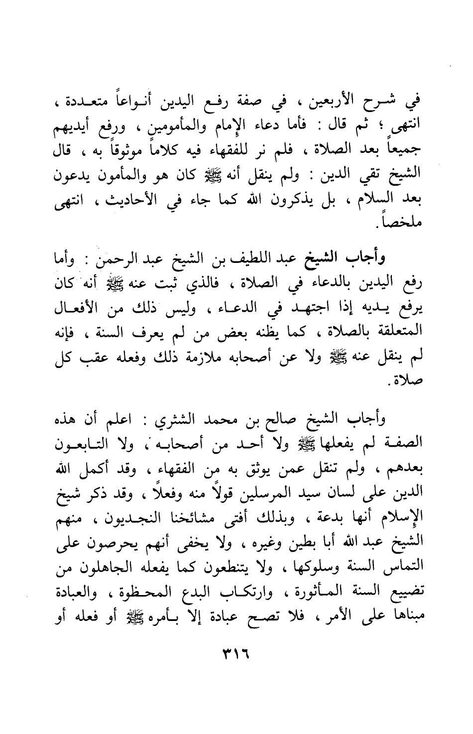 وأجاب الشيخ عبد اللطيف بن الشيخ عبد الرحمن: وأما رفع اليدين بالدعاء في الصلاة، فالذي ثبت عنه صلى الله عليه وسلم أنه كان يرفع يديه إذا اجتهد في الدعاء، وليس ذلك من الأفعال المتعلقة بالصلاة، كما يظنه بعض من لم يعرف السنة، فإنه لم ينقل عنه صلى الله عليه وسلم ولا عن أصحابه ملازمة ذلك وفعله عقب كل صلاة.
