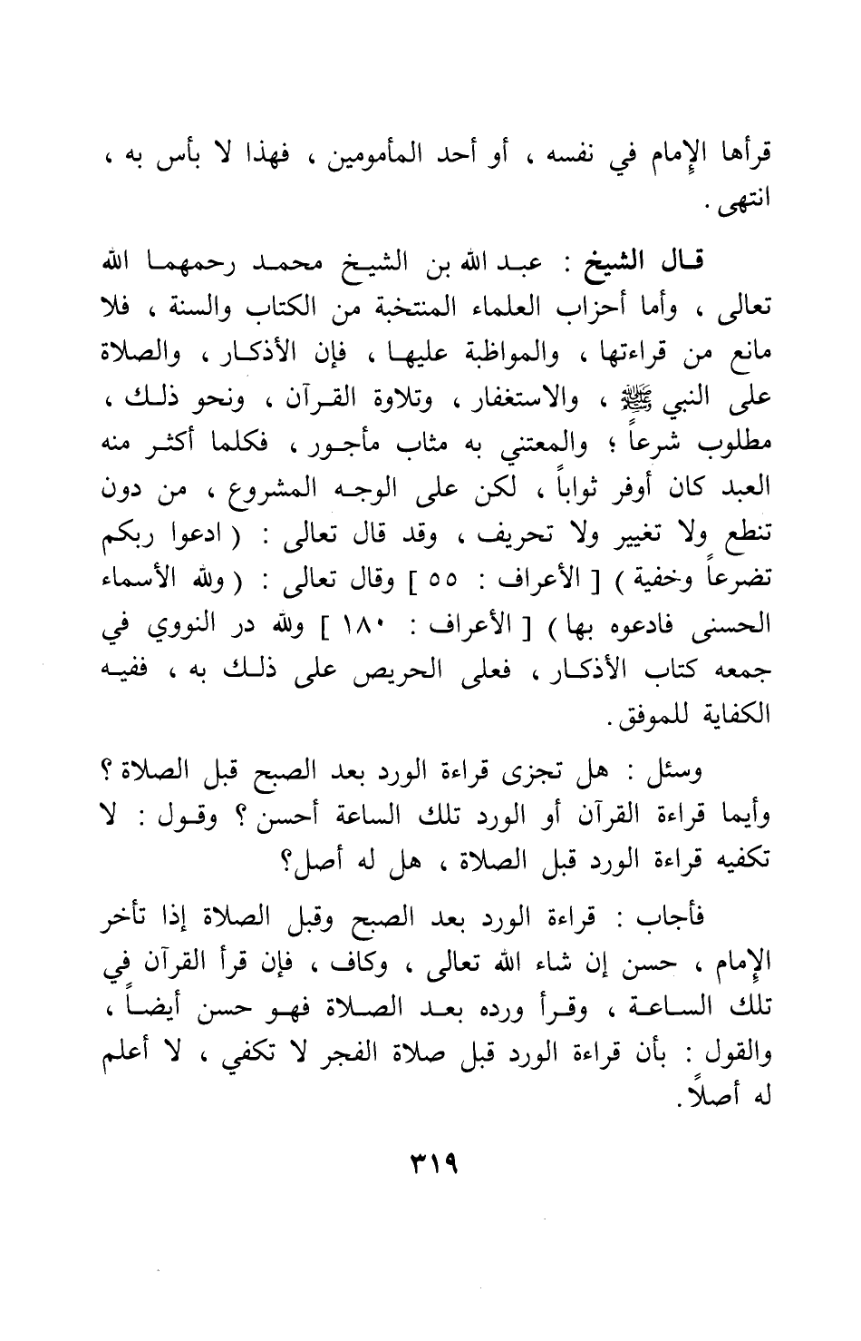 فأجاب: قراءة الورد بعد الصبح وقبل الصلاة إذا تأخر الإمام، حسن إن شاء الله تعالى، وكاف؛ فإن قرأ القرآن في تلك الساعة، وقرأ ورده بعد الصلاة فهو حسن أيضاً. والقول بأن قراءة الورد قبل صلاة الفجر لا تكفي، لا أعلم له أصلاً.