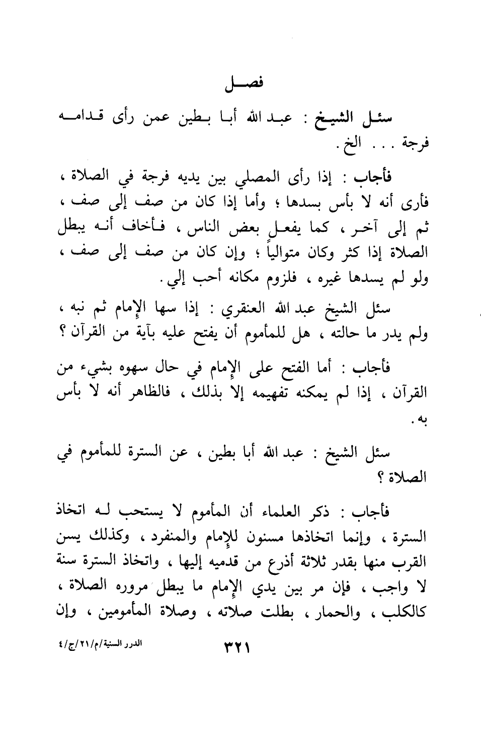 سئل الشيخ عبد الله أبا بطين: عمن رأى قدامه فرجة ... إلخ؟