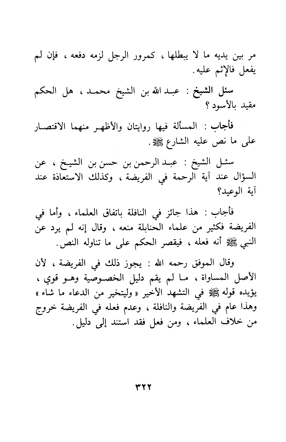 سئل الشيخ عبد الرحمن بن حسن بن الشيخ: عن السؤال عند آية الرحمة في الفريضة، وكذلك الاستعاذة عند آية الوعيد؟