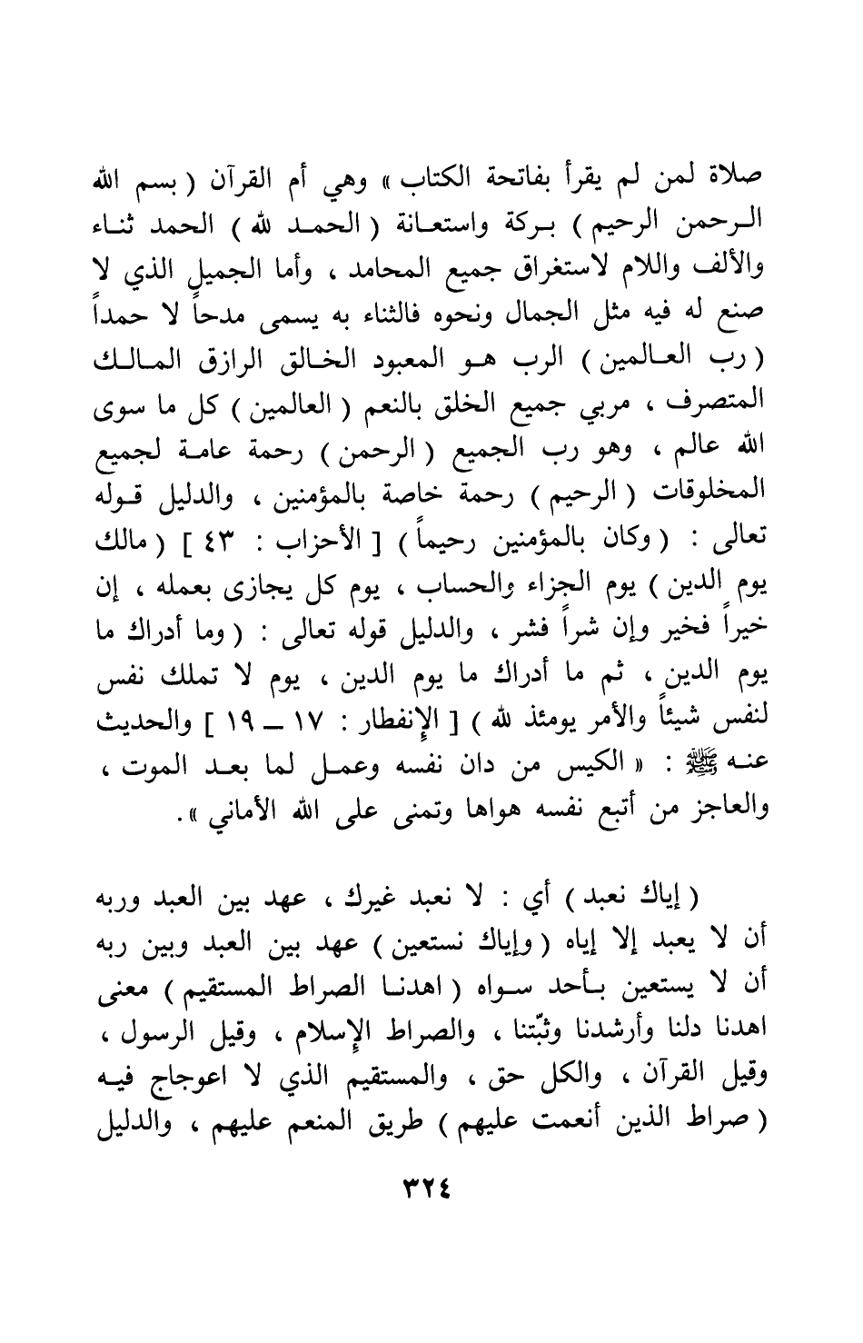 صلاة لمن لم يقرأ بفاتحة الكتاب " 1، وهي أم القرآن {بِسْمِ اللَّهِ الرَّحْمَنِ الرَّحِيمِ} [سورة الفاتحة آية: 1] : بركة واستعانة. {الْحَمْدُ لِلَّهِ} : الحمد ثناء، والألف واللام لاستغراق جميع المحامد؛ وأما الجميل الذي لا صنع له فيه مثل الجمال ونحوه فالثناء به يسمى مدحاً لا حمداً. {رَبِّ الْعَالَمِينَ} : الرب هو المعبود الخالق الرازق المالك المتصرف، مربي جميع الخلق بالنعم. {الْعَالَمِينَ} : كل ما سوى الله عالم، وهو رب الجميع. {الرَّحْمَنِ} : رحمة عامة لجميع المخلوقات. {الرَّحِيمِ} : رحمة خاصة بالمؤمنين، والدليل: قوله تعالى: {وَكَانَ بِالْمُؤْمِنِينَ رَحِيماً} [سورة الأحزاب آية: 43] . {مَالِكِ يَوْمِ الدِّينِ} [سورة الفاتحة آية: 4] : يوم الجزاء والحساب، يوم كل يجازى بعمله، إن خيراً فخير وإن شراً فشر، والدليل: قوله تعالى: {وَمَا أَدْرَاكَ مَا يَوْمُ الدِّينِ ثُمَّ مَا أَدْرَاكَ مَا يَوْمُ الدِّينِ يَوْمَ لا تَمْلِكُ نَفْسٌ لِنَفْسٍ شَيْئاً وَالأَمْرُ يَوْمَئِذٍ لِلَّهِ} [سورة الانفطار آية: 17-19] ، والحديث عنه صلى الله عليه وسلم: " الكيِّس من دان نفسه وعمل لما بعد الموت، والعاجز من أتبع نفسه هواها وتمنى على الله الأماني " 2.