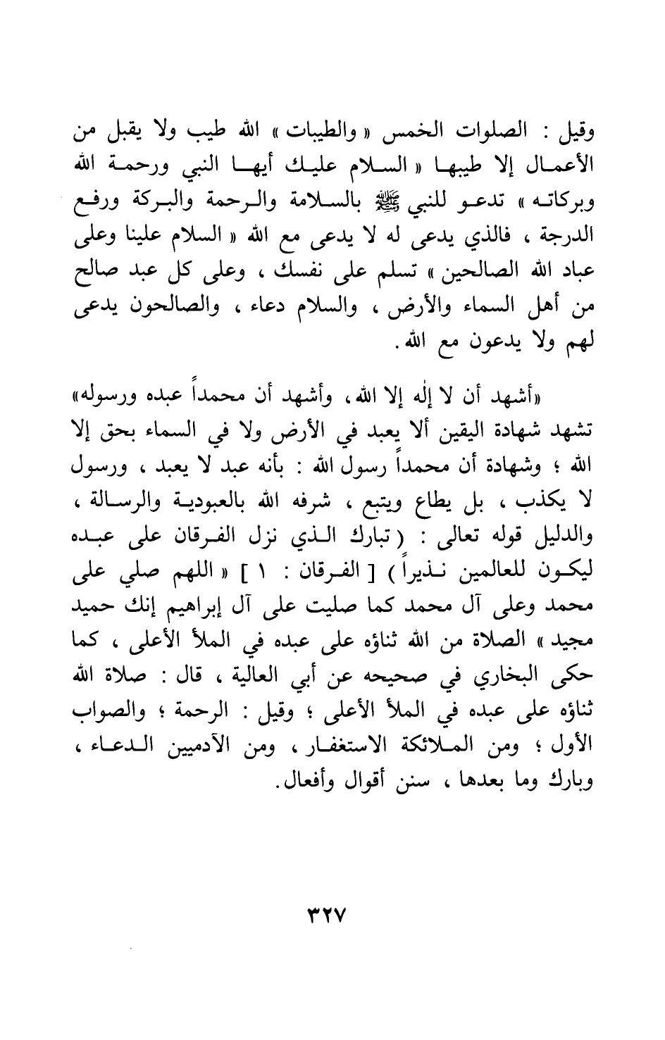 " أشهد أن لا إله إلا الله، وأشهد أن محمداً عبده ورسوله " 3: تشهد شهادة اليقين ألا يعبد في الأرض ولا في السماء بحق إلا الله; وشهادة أن محمداً رسول الله: بأنه عبد لا يعبد، ورسول لا يُكَذَّب، بل يطاع ويُتَّبَع، شرفه الله بالعبودية والرسالة؛ والدليل: قوله تعالى: {َبَارَكَ الَّذِي نَزَّلَ الْفُرْقَانَ عَلَى عَبْدِهِ لِيَكُونَ لِلْعَالَمِينَ نَذِيراً} [سورة الفرقان آية: 1] . "اللهم صل على محمد وعلى آل محمد، كما صليت على آل إبراهيم، إنك حميد مجيد " 4: الصلاة من الله: ثناؤه على عبده في الملإ الأعلى، كما حكى البخاري في صحيحه عن أبي العالية، قال: صلاة الله ثناؤه على عبده في الملإ الأعلى; وقيل: الرحمة; والصواب الأول; ومن الملائكة: الاستغفار، ومن الآدميين: الدعاء، وبارِك وما بعدها: سنن أقوال وأفعال.