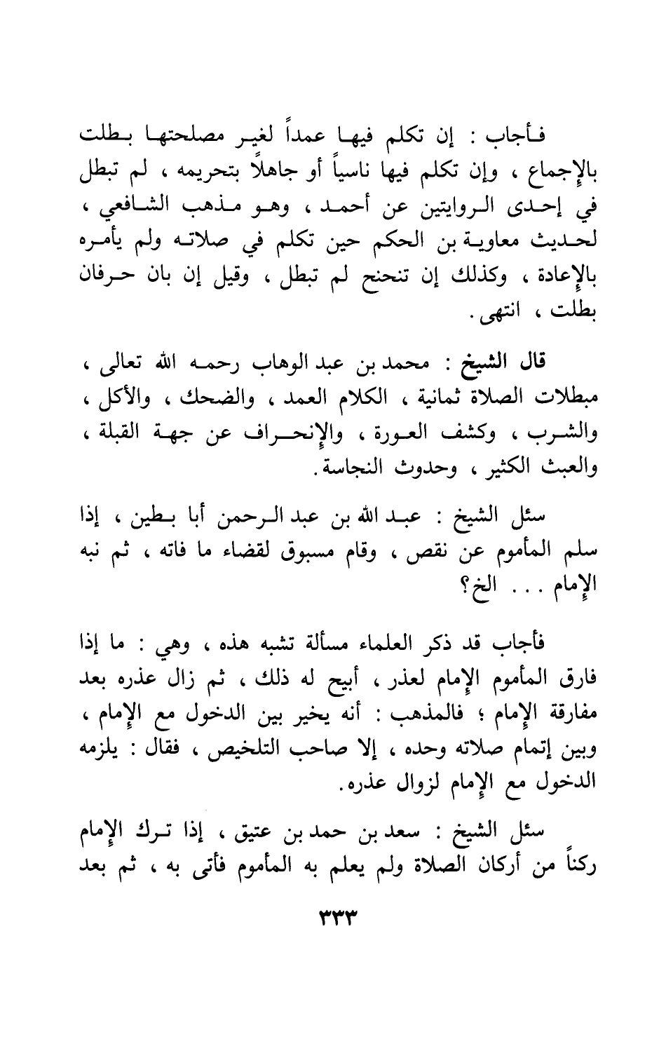 فأجاب: إن تكلم فيها عمداً لغير مصلحتها بطلت بالإجماع، وإن تكلم فيها ناسياً أو جاهلاً بتحريمه، لم تبطل في إحدى الروايتين عن أحمد؛ وهو مذهب الشافعي، لحديث معاوية بن الحكم حين تكلم في صلاته ولم يأمره بالإعادة. وكذلك إن تنحنح لم تبطل، وقيل إن بان حرفان بطلت. انتهى.