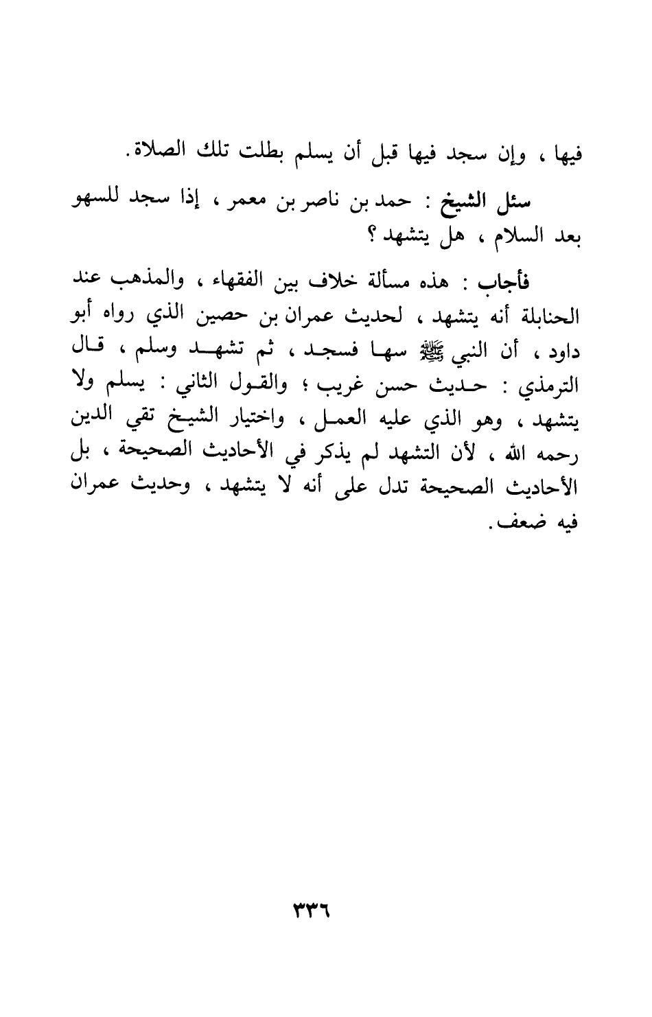والقول الثاني: يسلم ولا يتشهد، وهو الذي عليه العمل، واختيار الشيخ تقي الدين، رحمه الله، لأن التشهد لم يذكر في الأحاديث الصحيحة؛ بل الأحاديث الصحيحة تدل على أنه لا يتشهد، وحديث عمران فيه ضعف.