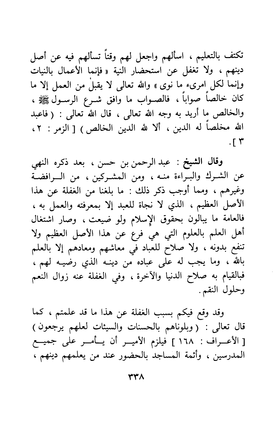 وقال الشيخ عبد الرحمن بن حسن، بعد ذكره النهي عن الشرك والبراءة منه، ومن المشركين، من الرافضة وغيرهم: ومما أوجب ذكر ذلك، ما بلغنا من الغفلة عن هذا الأصل العظيم، الذي لا نجاة للعبد إلا بمعرفته والعمل به؛ فالعامة ما يبالون بحقوق الإسلام ولو ضيعت، وصار اشتغال أهل العلم بالعلوم التي هي فرع عن هذا الأصل العظيم ولا تنفع بدونه، ولا صلاح للعباد في معاشهم ومعادهم إلا بالعلم بالله، وما يجب له على عباده من دينه الذي رضيه لهم؛ فبالقيام به صلاح الدنيا والآخرة، وفي الغفلة عنه زوال النعم وحلول النقم.