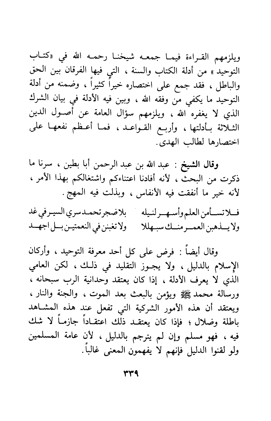 ويلزمهم القراءة فيما جمعه شيخنا، رحمه الله، في "كتاب التوحيد" من أدلة الكتاب والسنة، التي فيها الفرقان بين الحق والباطل؛ فقد جمع على اختصاره خيراً كثيراً، وضمنه من أدلة التوحيد ما يكفي من وفقه الله، وبين فيه الأدلة في بيان الشرك الذي لا يغفره الله. ويلزمهم سؤال العامة عن أصول الدين الثلاثة بأدلتها، وأربع القواعد؛ فما أعظم نفعها على اختصارها لطالب الهدى!