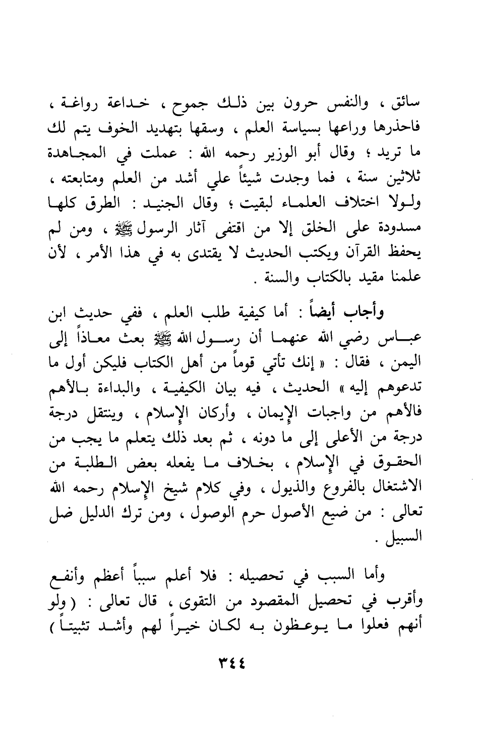 وأجاب أيضاً: أما كيفية طلب العلم، ففي حديث ابن عباس، رضي الله عنهما، أن رسول الله صلى الله عليه وسلم " بعث معاذاً إلى اليمن، فقال: إنك تأتي قوماً من أهل الكتاب، فليكن أول ما تدعوهم إليه ... " 1 الحديث، فيه بيان الكيفية، والبداءة بالأهم فالأهم من واجبات الإيمان، وأركان الإسلام، وينتقل درجة درجة من الأعلى إلى ما دونه. ثم بعد ذلك يتعلم ما يجب من الحقوق في الإسلام، بخلاف ما يفعله بعض الطلبة من الاشتغال بالفروع والذيول؛ وفي كلام شيخ الإسلام، رحمه الله تعالى: من ضيع الأصول حرم الوصول، ومن ترك الدليل ضل السبيل.