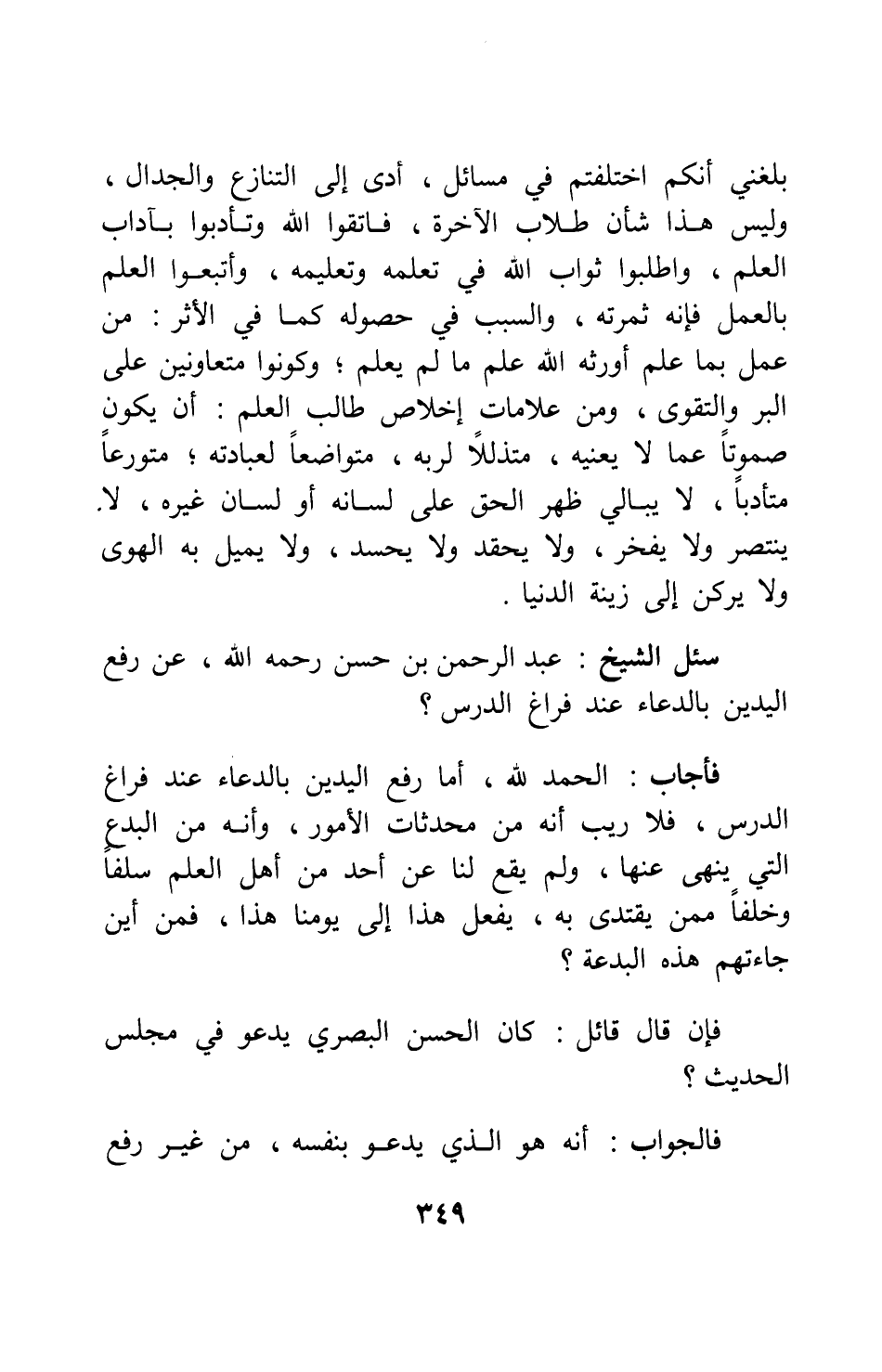 سئل الشيخ عبد الرحمن بن حسن، رحمه الله: عن رفع اليدين بالدعاء عند فراغ الدرس؟