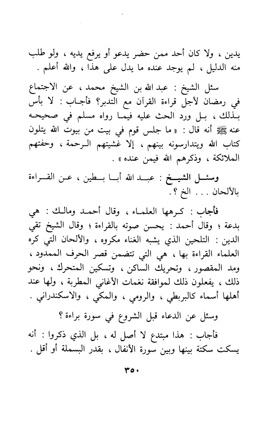 سئل الشيخ عبد الله بن الشيخ محمد: عن الاجتماع في رمضان لأجل قراءة القرآن مع التدبر؟