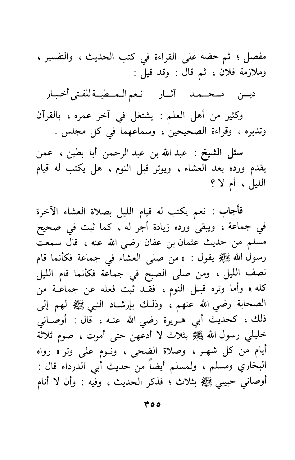 سئل الشيخ عبد الله بن عبد الرحمن أبا بطين: عمن يقدم ورده بعد العشاء، ويوتر قبل النوم، هل يكتب له قيام الليل، أم لا؟