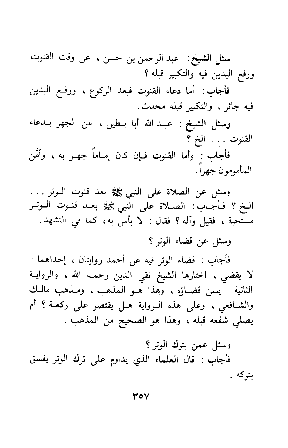 سئل الشيخ عبد الرحمن بن حسن: عن وقت القنوت ورفع اليدين فيه والتكبير قبله؟
