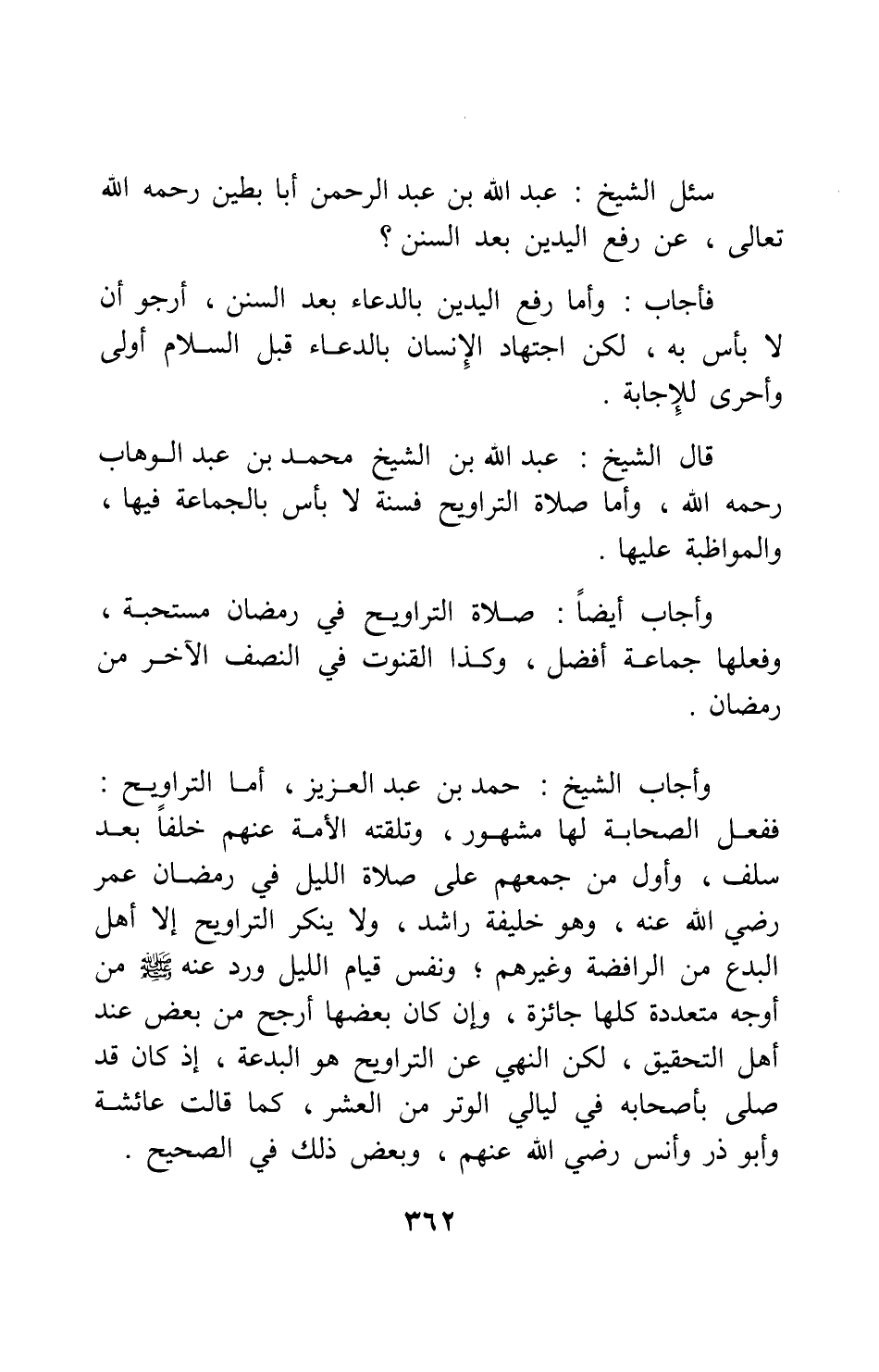 وأجاب الشيخ حمد بن عبد العزيز: أما التراويح، ففعل الصحابة لها مشهور، وتلقته الأمة عنهم خلفاً بعد سلف؛ وأول من جمعهم على صلاة الليل في رمضان عمر رضي الله عنه وهو خليفة راشد. ولا ينكر التراويح إلا أهل البدع من الرافضة وغيرهم; ونفس قيام الليل ورد عنه صلى الله عليه وسلم من أوجه متعددة كلها جائزة، وإن كان بعضها أرجح من بعض عند أهل التحقيق، لكن النهي عن التراويح هو البدعة، إذ كان قد صلى بأصحابه في ليالي الوتر من العشر، كما قالت عائشة وأبو ذر وأنس، رضي الله عنهم، وبعض ذلك في الصحيح.
