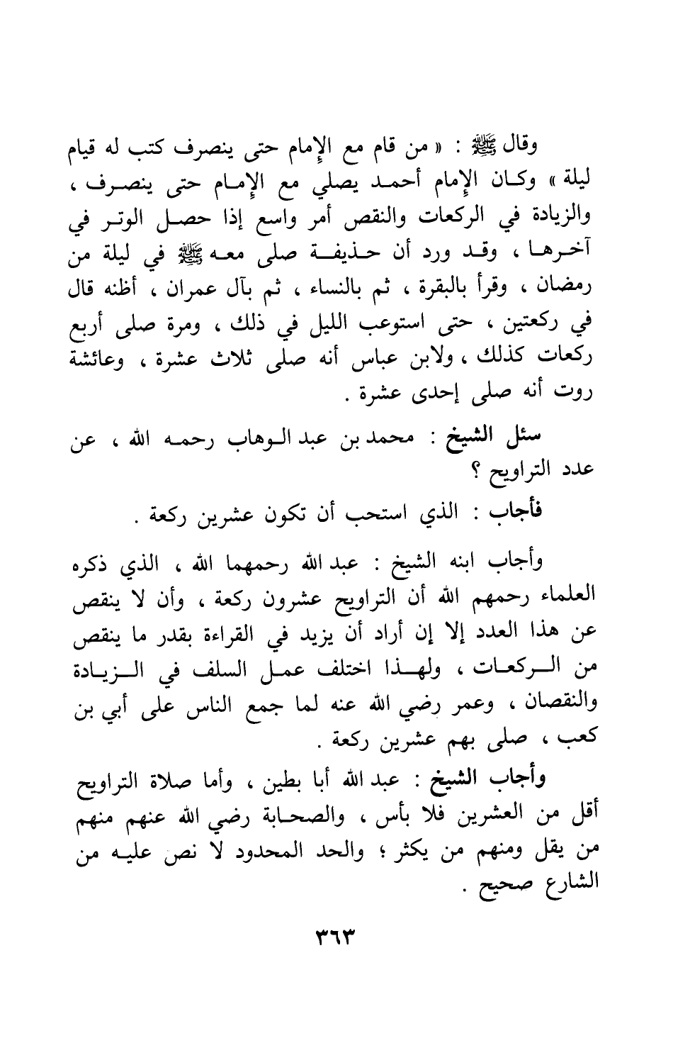 سئل الشيخ محمد بن عبد الوهاب، رحمه الله: عن عدد التراويح؟